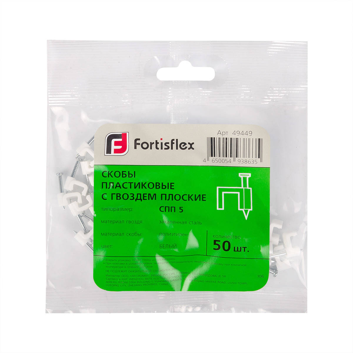 Скоба пластиковая СПП 8 (50шт) Fortisflex 103942 — предназначена для монтажа плоских кабелей и проводов на деревянных поверхностях и гипсокартоне.