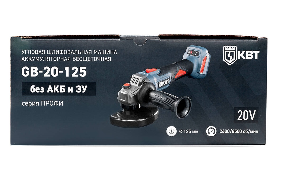 Угловая шлифовальная машина GB-20-125 без АКБ и ЗУ серия ПРОФИ (КВТ) 104538 - предназначена для работы с камнем, бетоном, сталью, деревом и другим материалом (для зачистки, шлифовки и резки металлов, бетона и камня при установке соответствующих шлифовальных, отрезных, алмазных дисков).