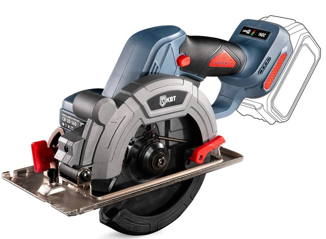 Пила циркулярная аккумуляторная CB-20-140 без АКБ и ЗУ серия ПРОФИ (КВТ) 104540 - предназначена для выполнения продольных, поперечных и угловых резов в древесине, ДСП, фанере, а также пластмассах и алюминиевых профилях с использованием соответствующего пильного диска.