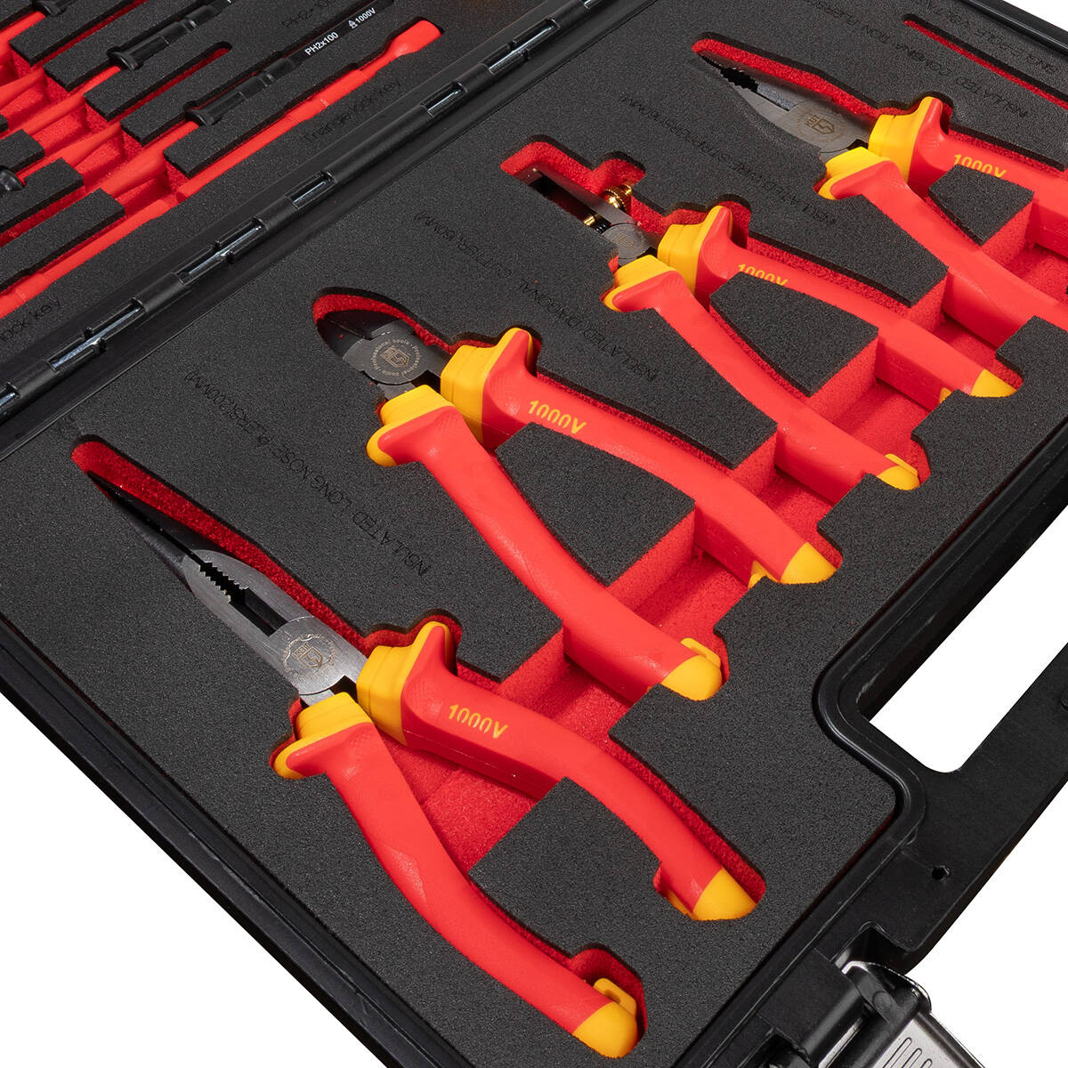 | Состав набора | диэлектрический нож монтерский прямой диэлектрические пассатижи 180 мм диэлектрические бокорезы 160 мм диэлектрические длинногубцы 200 мм диэлектрический стриппер 160 мм рукоятка диэлектрическая для сменных бит бита диэлектрическая сменная: шлиц 3.0 х100 бита диэлектрическая сменная: шлиц 4.0 х100 бита диэлектрическая сменная: шлиц 5.5 х100 бита диэлектрическая сменная: шлиц 6.5х100 бита диэлектрическая сменная: PH1х80 бита диэлектрическая сменная: PH2х100 бита диэлектрическая сменная: PZ1х80 бита диэлектрическая сменная: PZ2х100 ключ-бита для электрошкафов треугольный профиль ключ-бита для электрошкафов квадратный профиль отвертка-индикатор упаковка: пластиковый кейс |