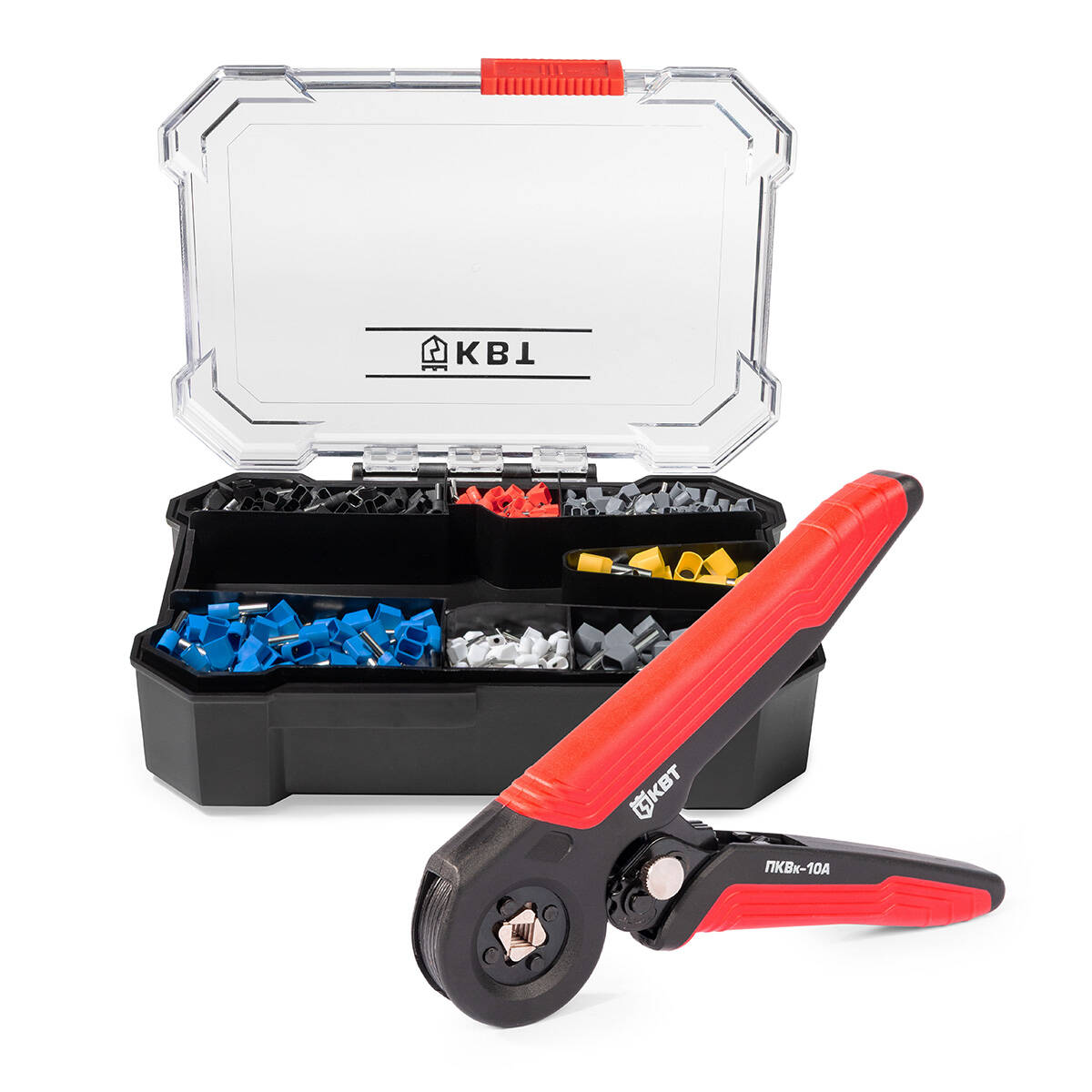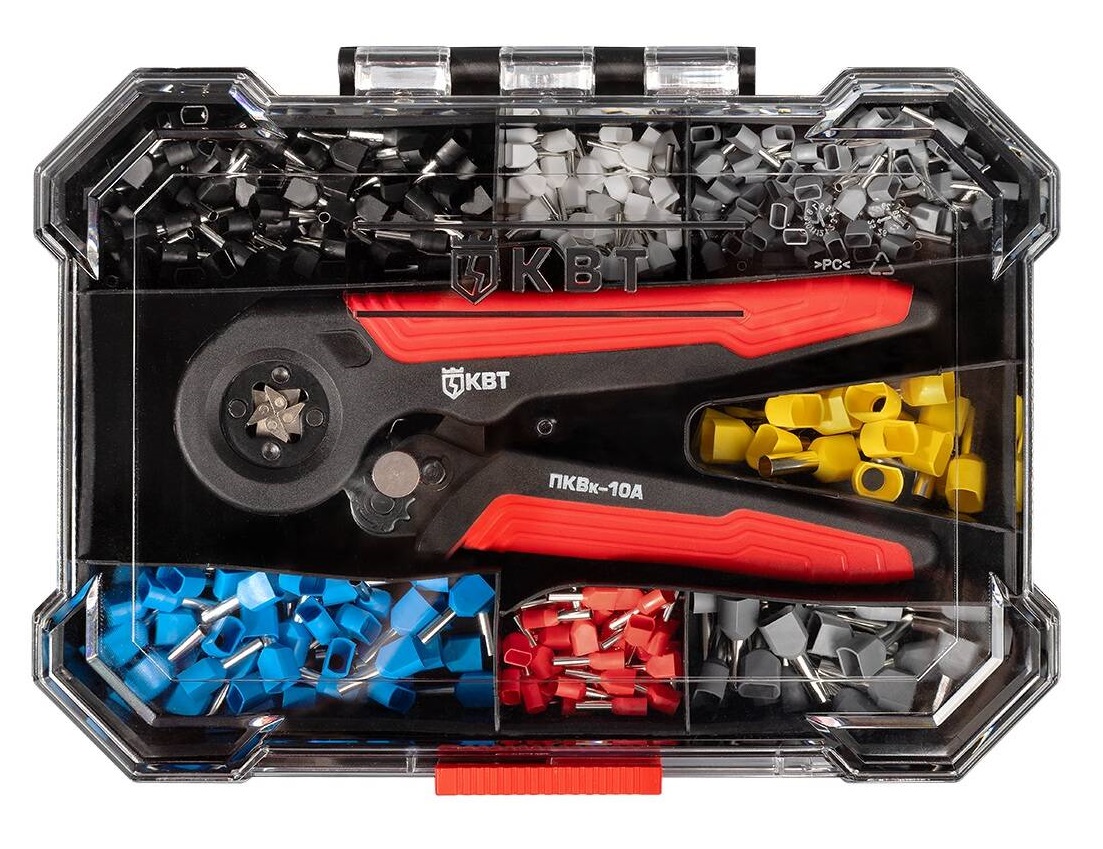 Набор втулочных наконечников НШВИ К-1490-1 (КВТ) 105673 — содержит популярные размеры одинарных и двойных втулочных наконечников, а также универсальный инструмент для их опрессовки.