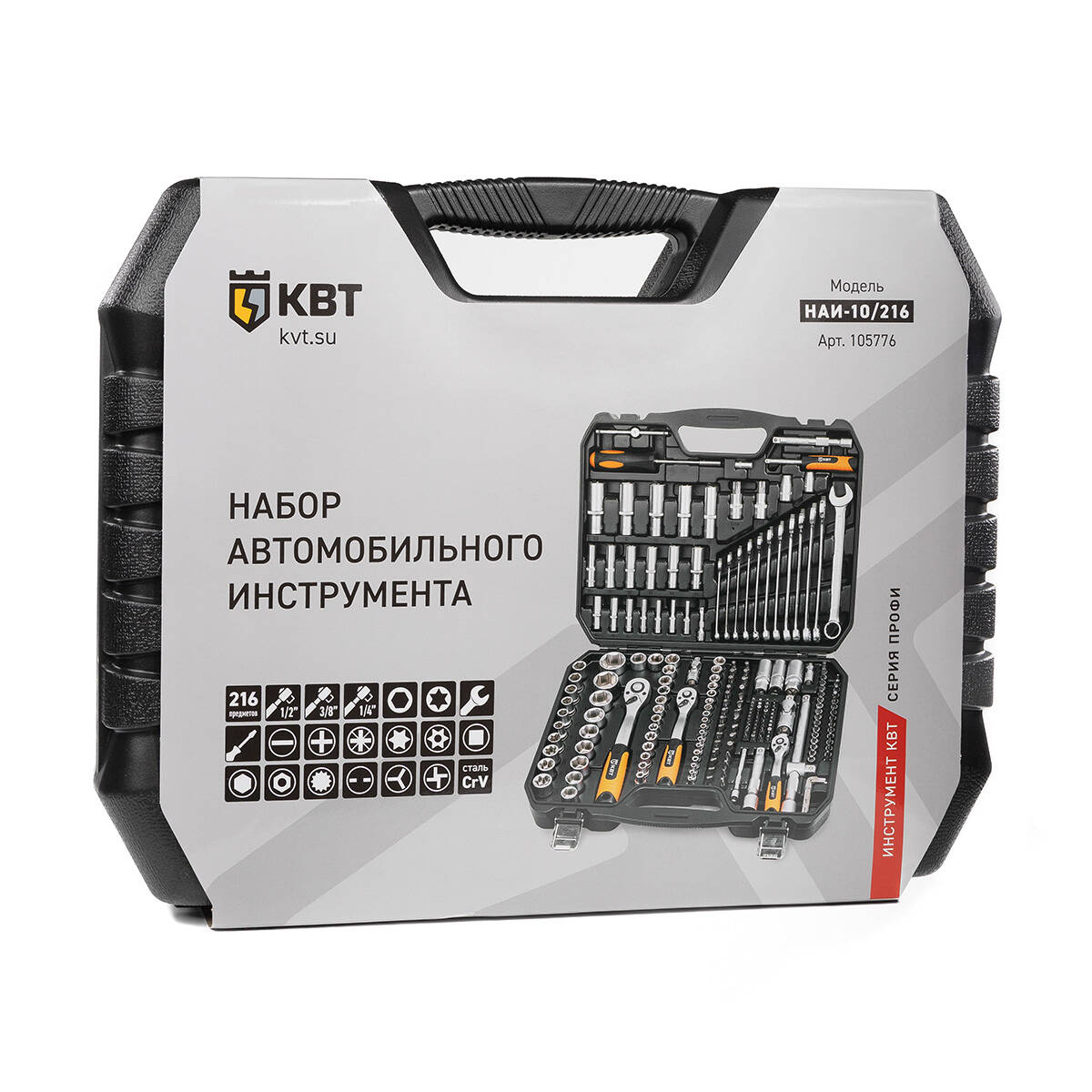 Набор инструментов НАИ-10/216 серия KBT-PROFESSIONAL (КВТ) 105776 - предназначен для проведения авторемонтных, слесарных и сантехнических работ.