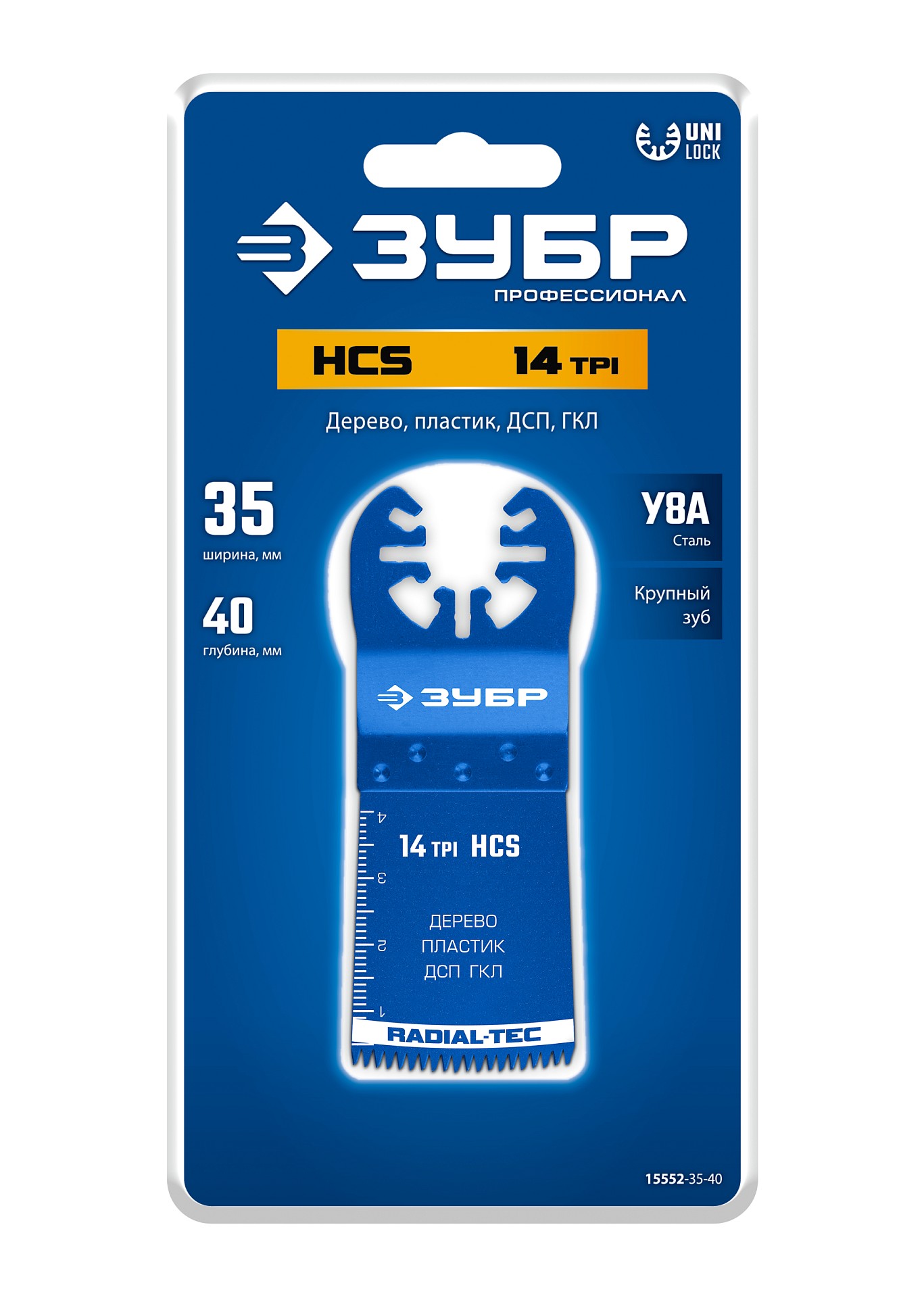 Полотно пильное, быстрый рез: дерево, пластик, ГКЛ ЗУБР HCS 35x40 мм, 14TPI 15552-35-40 - изготовлено из высококачественной углеродистой стали У8А (HCS) на автоматизированных производственных линиях с применением новейших методов шлифовки и заточки рабочей части.