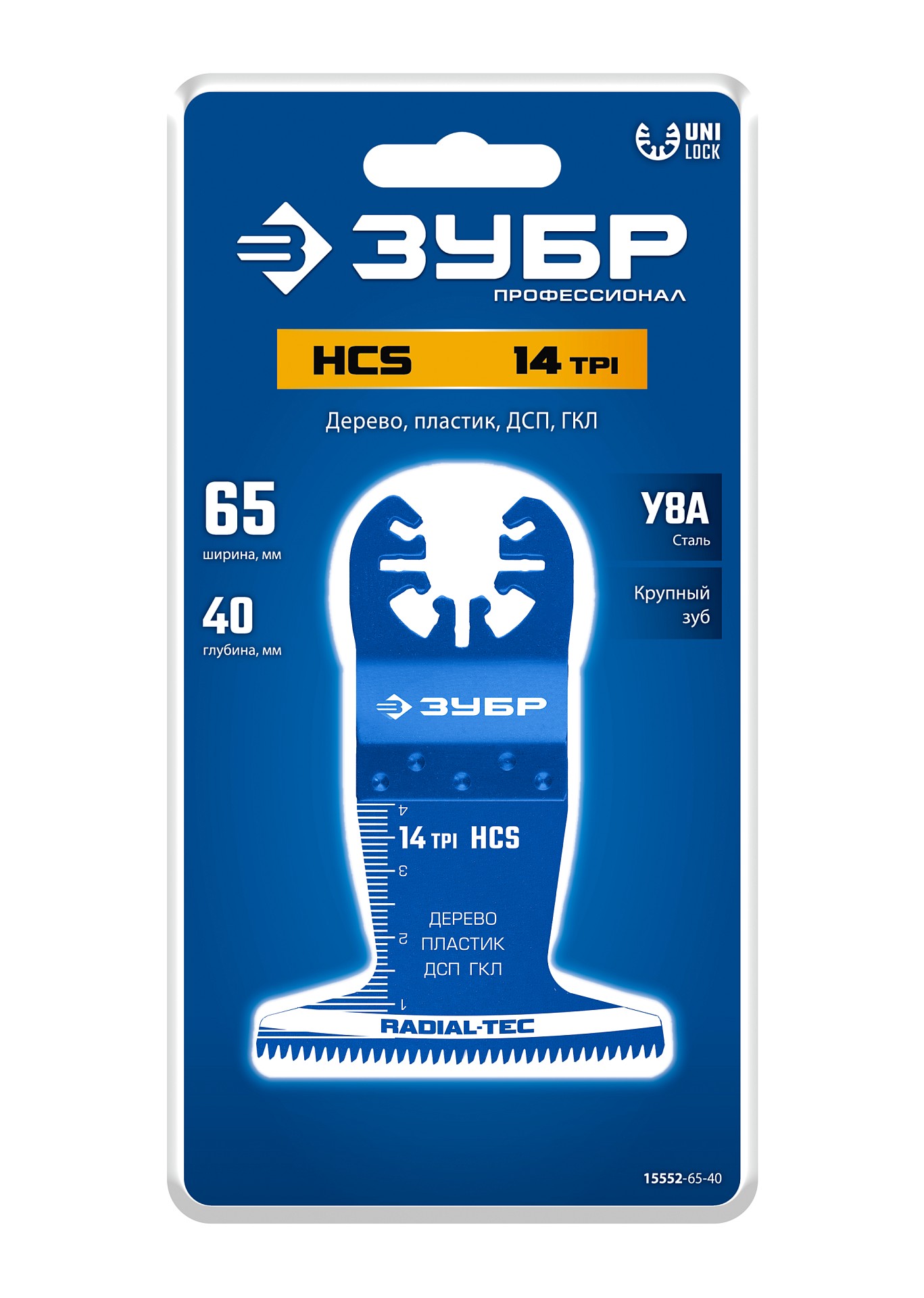 Полотно пильное, быстрый рез: дерево, пластик, ГКЛ ЗУБР HCS 65x40 мм, 14TPI 15552-65-40 - изготовлено из высококачественной углеродистой стали У8А (HCS) на автоматизированных производственных линиях с применением новейших методов шлифовки и заточки рабочей части.