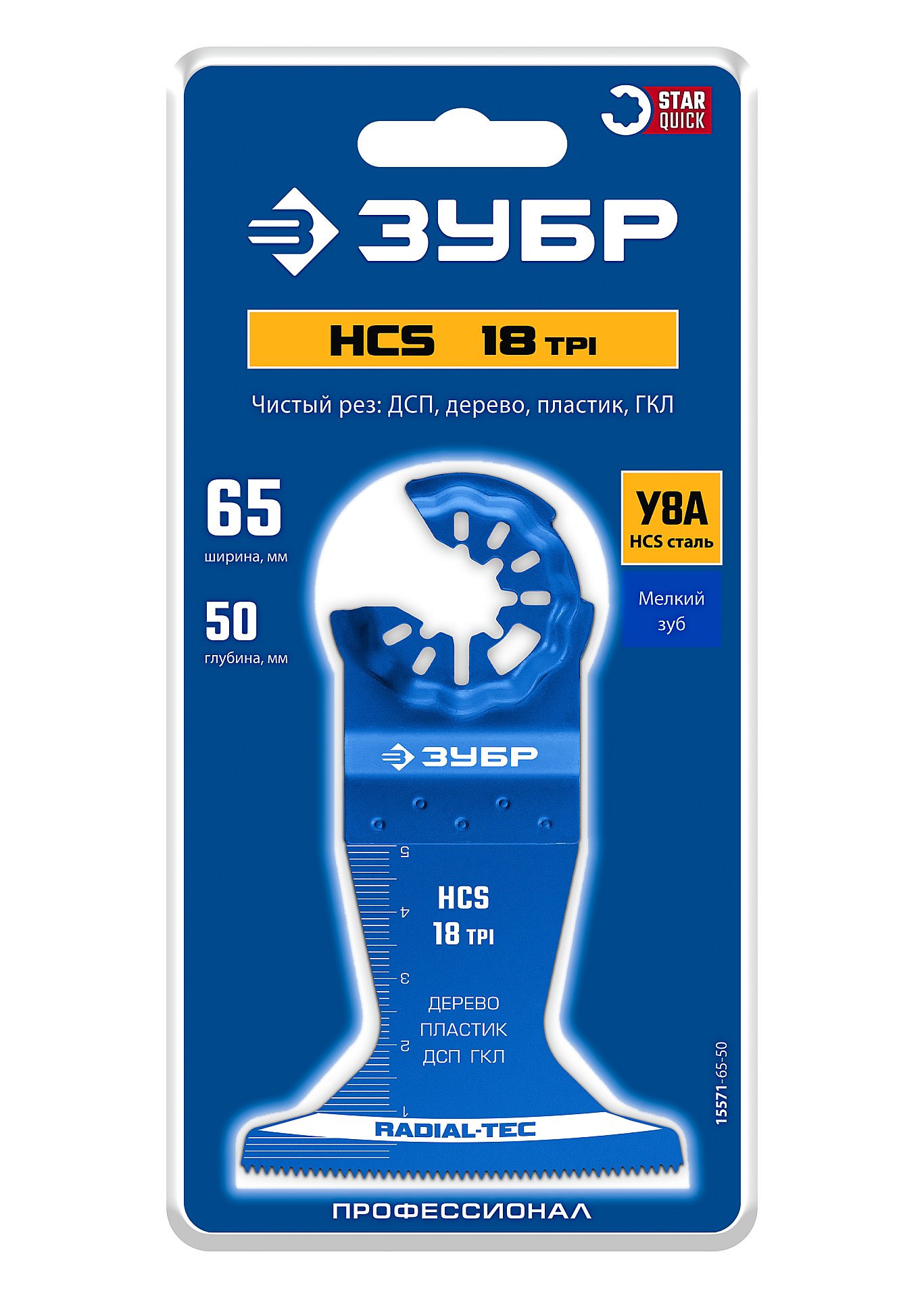 Полотно пильное 18TPI ЗУБР HCS 65x50 мм, чистый рез: дерево, пластик, ДСП, ГКЛ 15571-65-50 - применяется для пиления дерева, пластика, ГКЛ. StarQuick хвостовик совместим с большинством реноваторов.