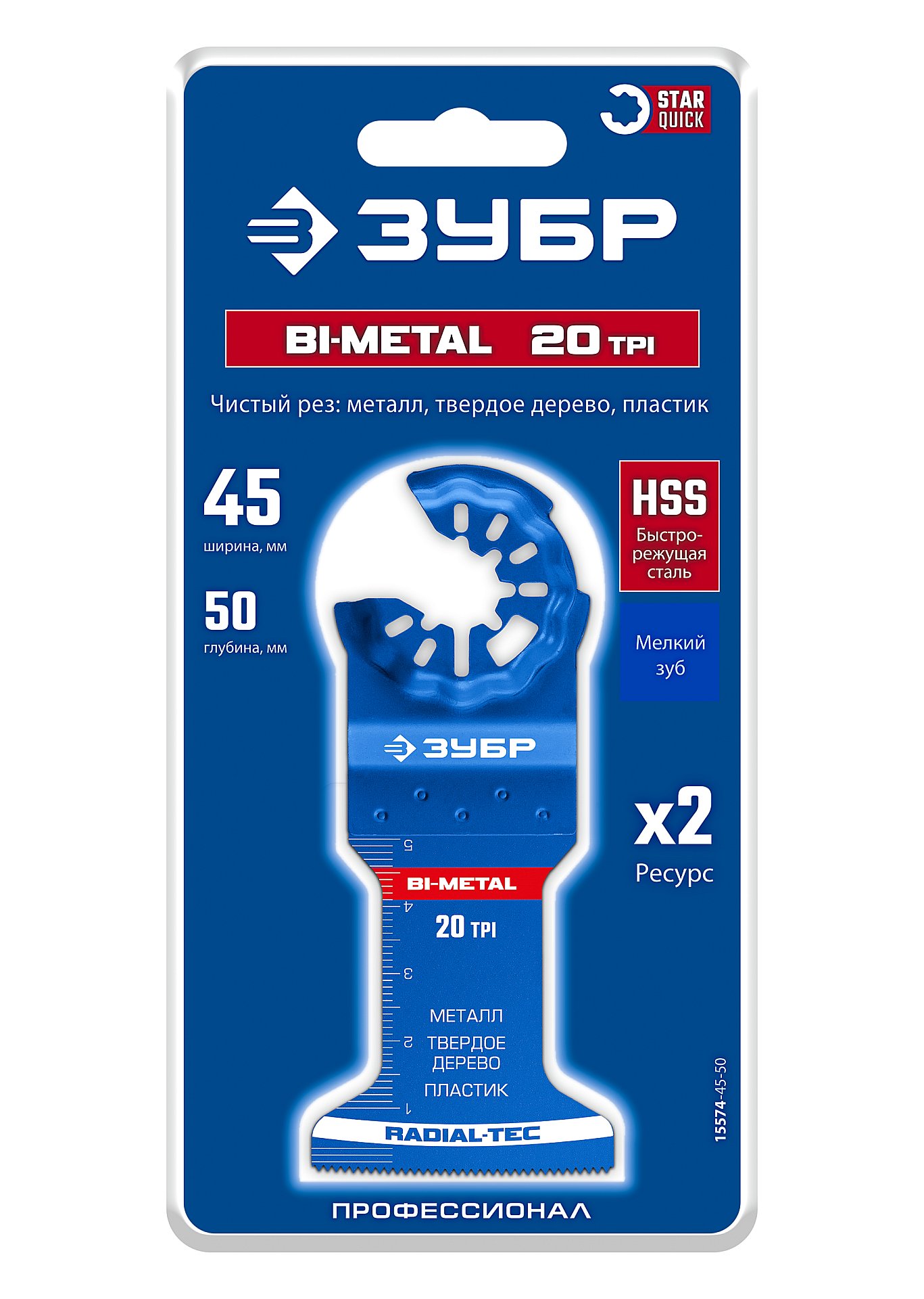 Полотно биметаллическое, чистый рез: металл, твердое дерево, пластик ЗУБР BIM 45x50 мм, 20TPI 15574-45-50 - применяется для пиления металла, дерева с гвоздями, сэндвич-панелей.