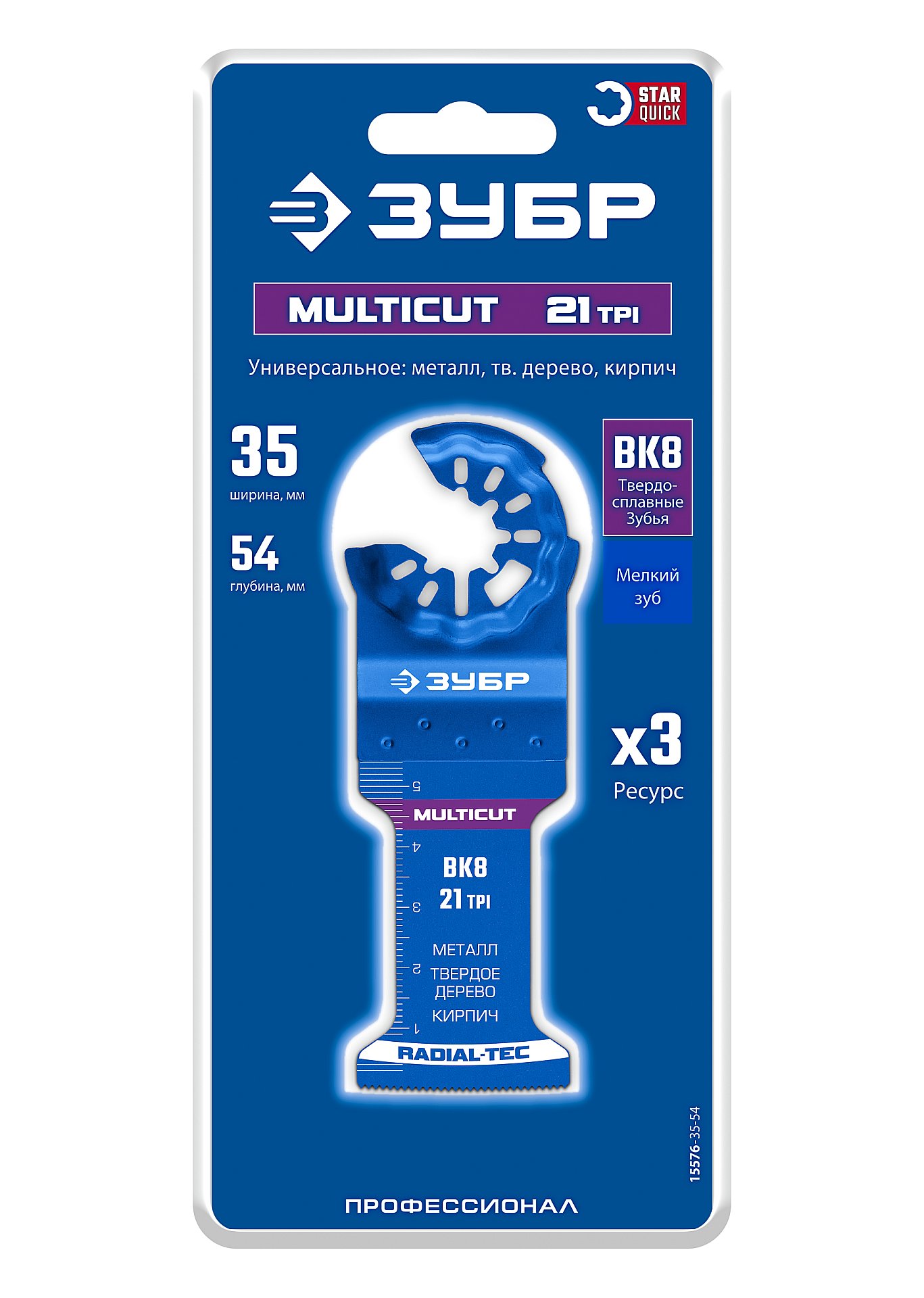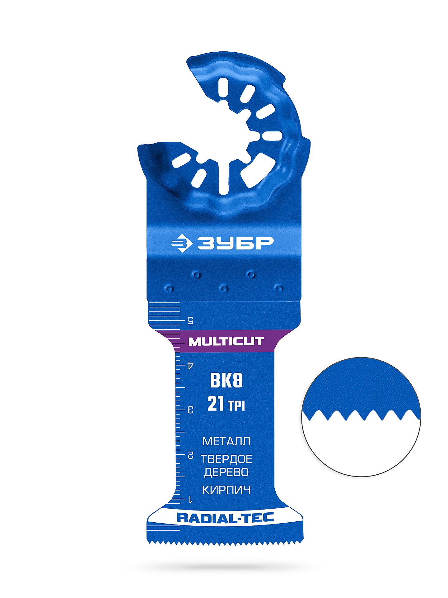 Полотно универсальное с твердосплавными зубьями: металл, твёрдое дерево, кирпич ЗУБР MULTICUT ВК8 21TPI, 35x54 мм 15576-35-54 - применяется для пиления металла, дерева, твердых материалов.