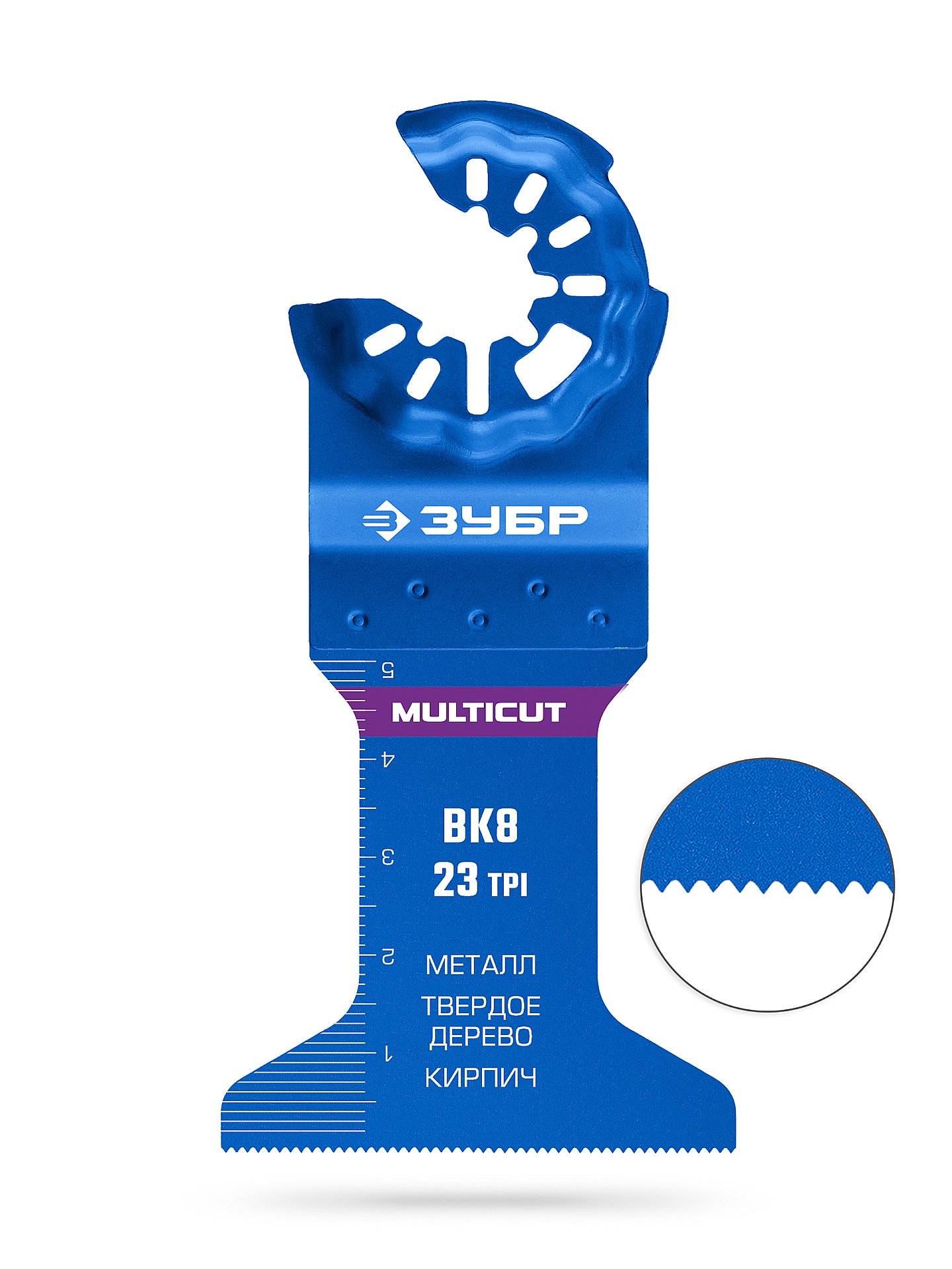 Полотно универсальное с твердосплавными зубьями: металл, твёрдое дерево, кирпич ЗУБР MULTICUT ВК8 23TPI, 52x50 мм 15576-52-50 - применяется для пиления металла, дерева, твердых материалов.