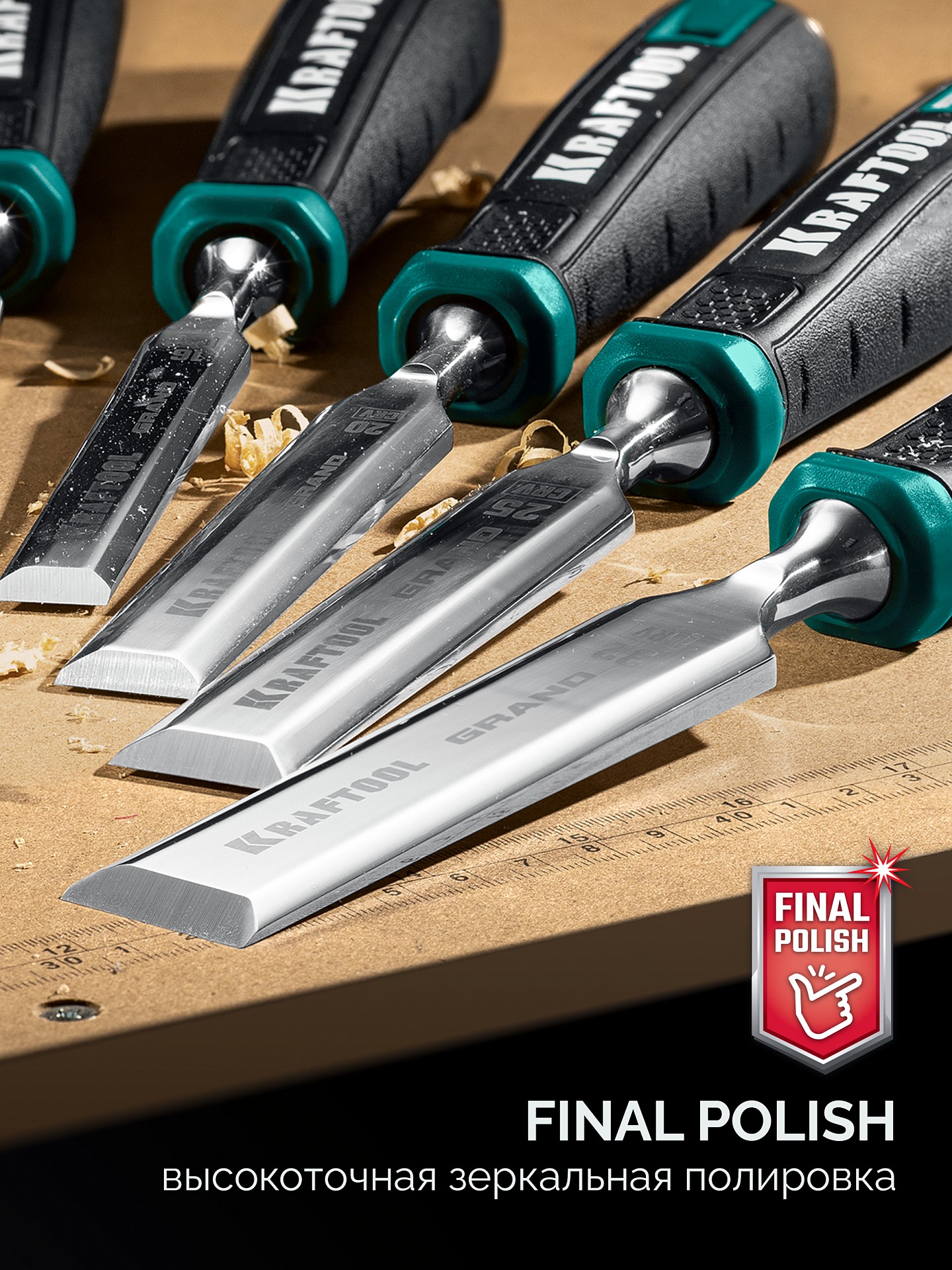 Набор стамесок-долот KRAFTOOL GRAND-4, 4 шт — профессиональная линейка стамесок из высококачественной инструментальной стали 100CrV с твердостью до 65 HRC. Зеркальная полировка лезвий и трехкомпонентная рукоятка со стальным затыльником обеспечивают высокую точность, надежность и долговечность при выполнении как резательных, так и ударных работ.