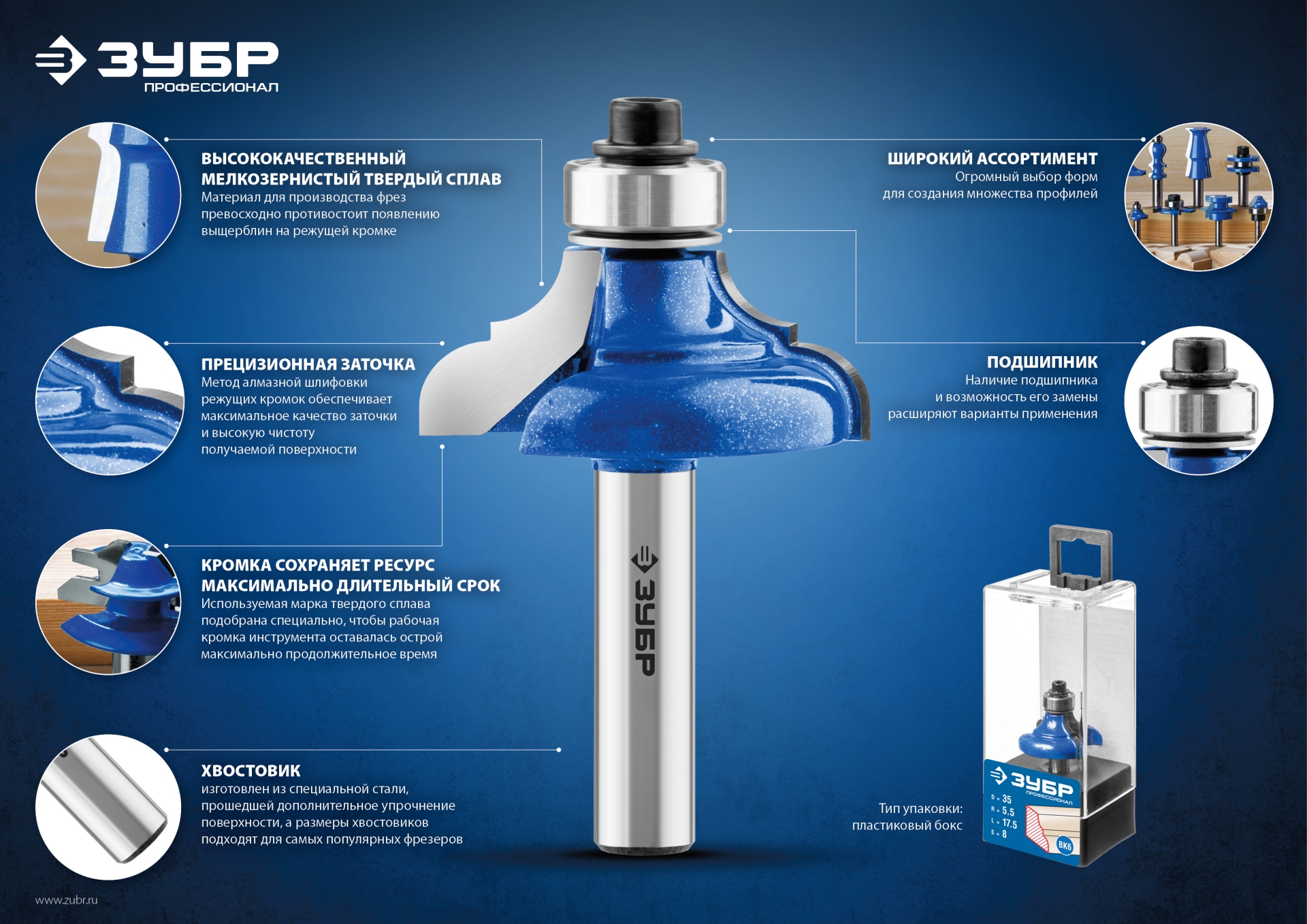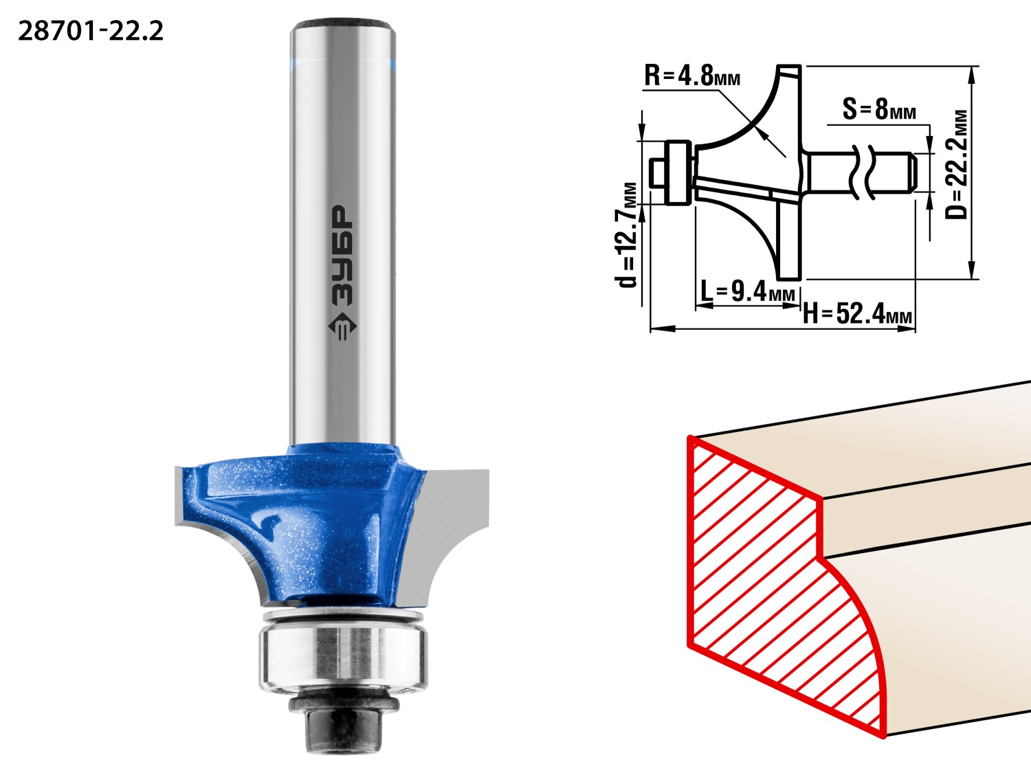 Фреза кромочная калевочная ЗУБР 28701-22.2, предназначена для скругления кромок при обработке столешниц, полок, шкафов и прочих работ с разнообразными видами древесины. Высококачественный твердый сплав для повышенного ресурса и чистоты обработки. Заточка производится только на самых современных станках с ЧПУ. Упорный подшипник позволяет обрабатывать криволинейные кромки без дополнительных приспособлений.