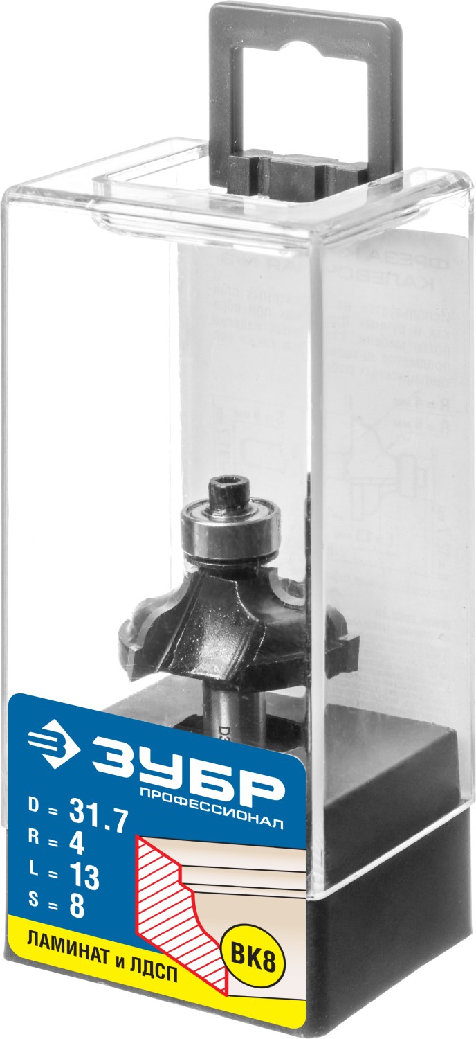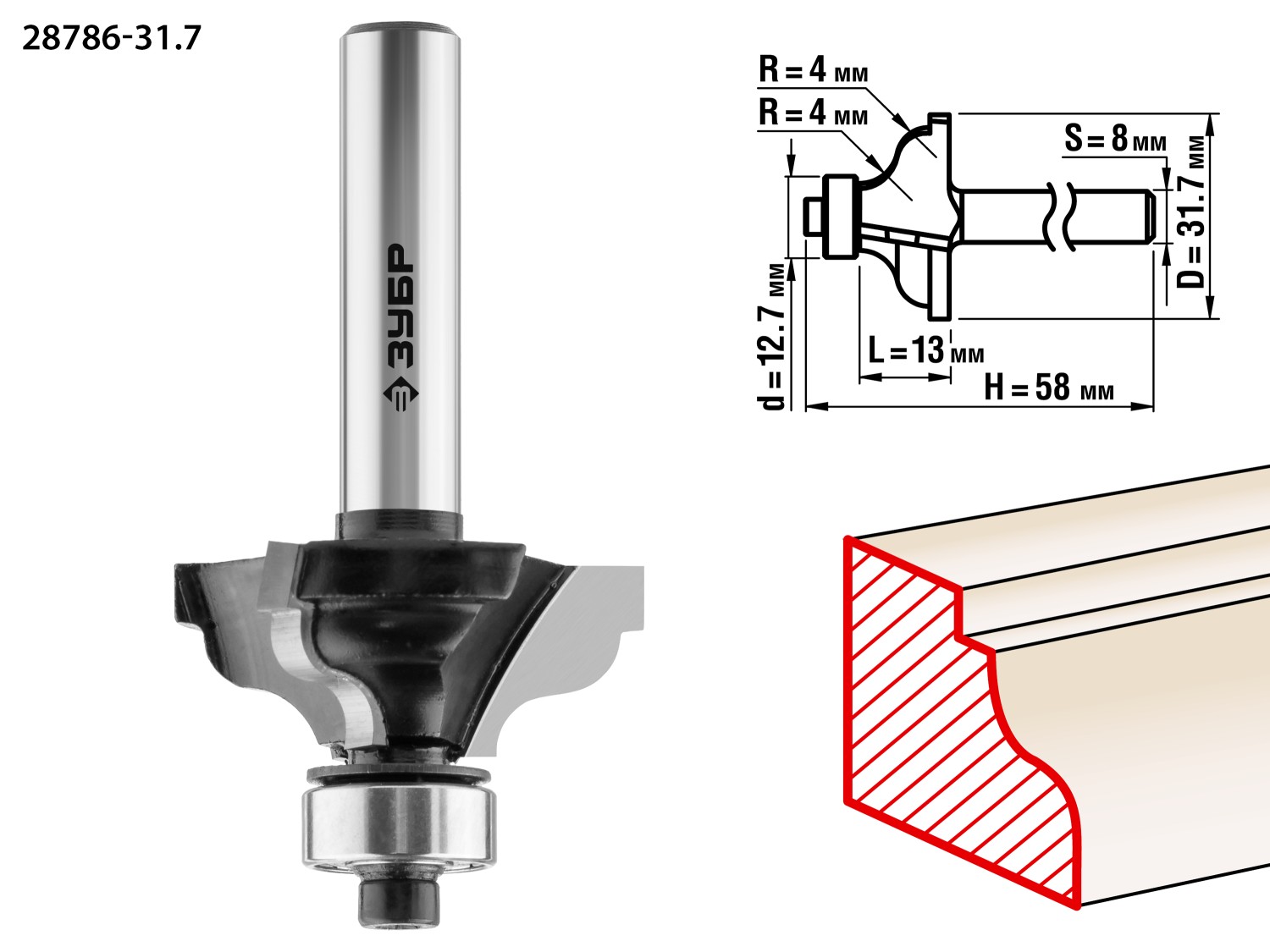 28786-31.7 Фреза ЗУБР ''ПРОФЕССИОНАЛ'' кромочная калевочная №3, диаметр-31.7 мм, рабочая длина-13 мм, радиус-4 мм, хвостовик-8 мм, диаметр подшипника-12,7 мм