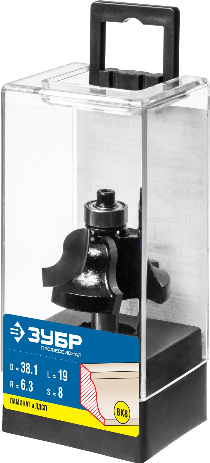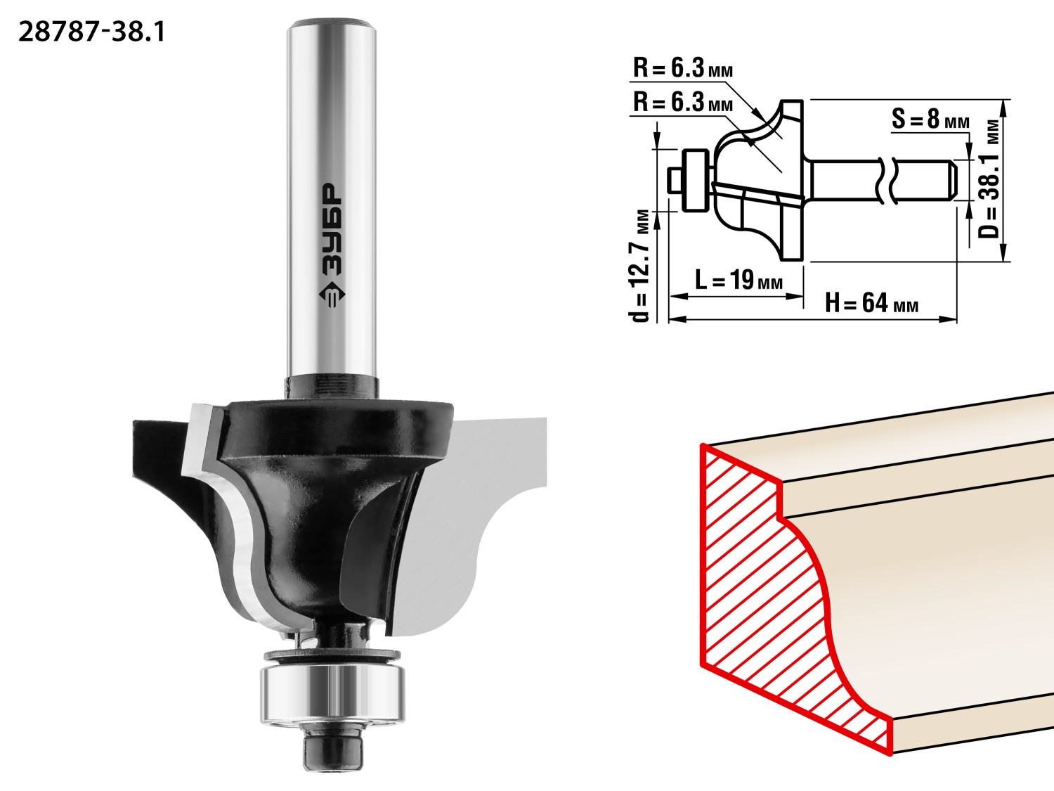 28787-38.1 Фреза ЗУБР ''ПРОФЕССИОНАЛ'' кромочная калевочная №4, диаметр-38.1 мм, рабочая длина-19 мм, радиус-6,3 мм, хвостовик-8 мм, диаметр подшипника-12,7 мм