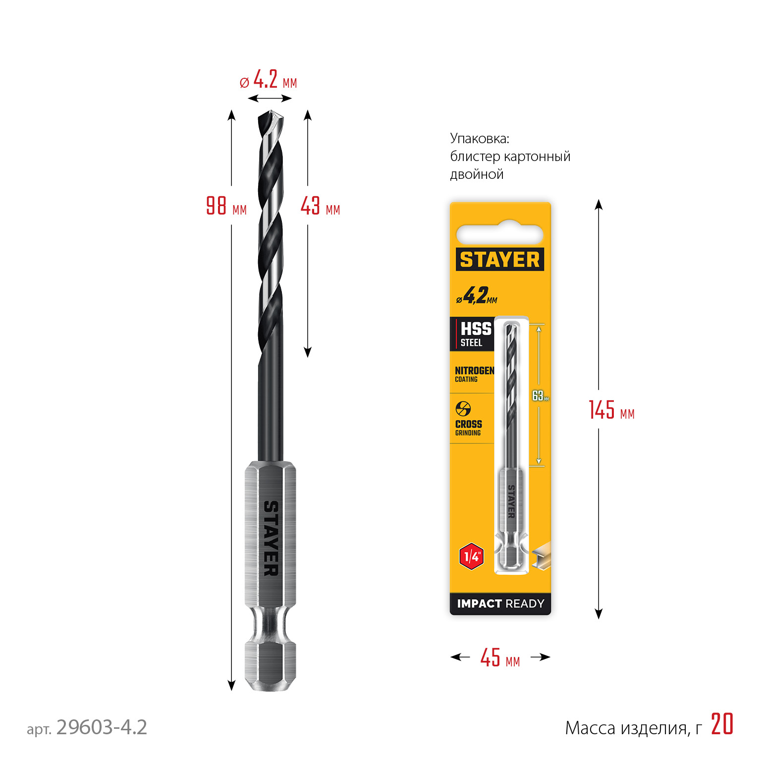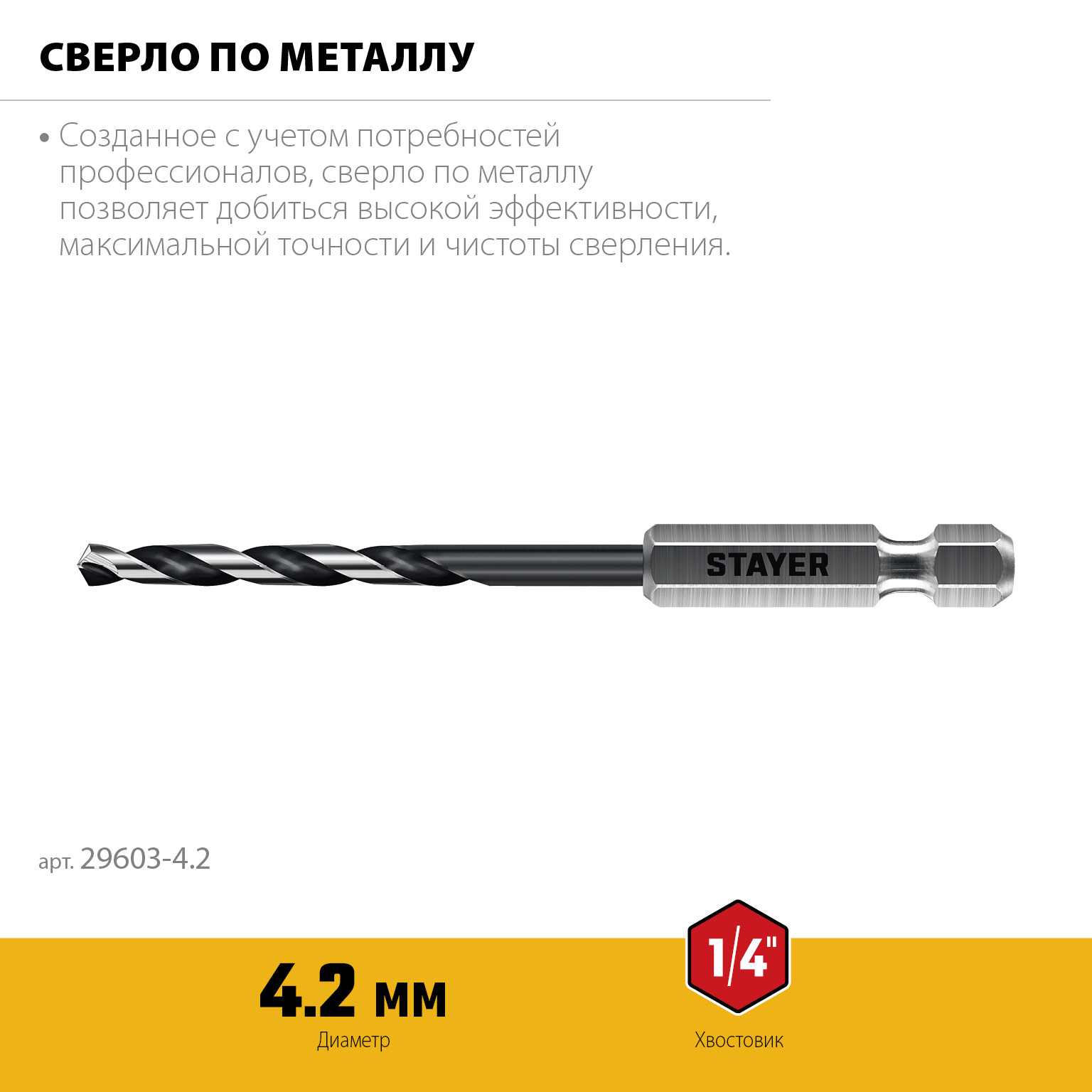 Сверло по металлу для винтовёртов и шуруповертов IMPACT READY STAYER НЕХ-1/4″, d 4.2 х 98 мм, 29603-4.2 - предназначено для обработки легированных и углеродистых сталей с пределом прочности до 800Н/мм^2, цветных металлов, серого чугуна и пластмассы.