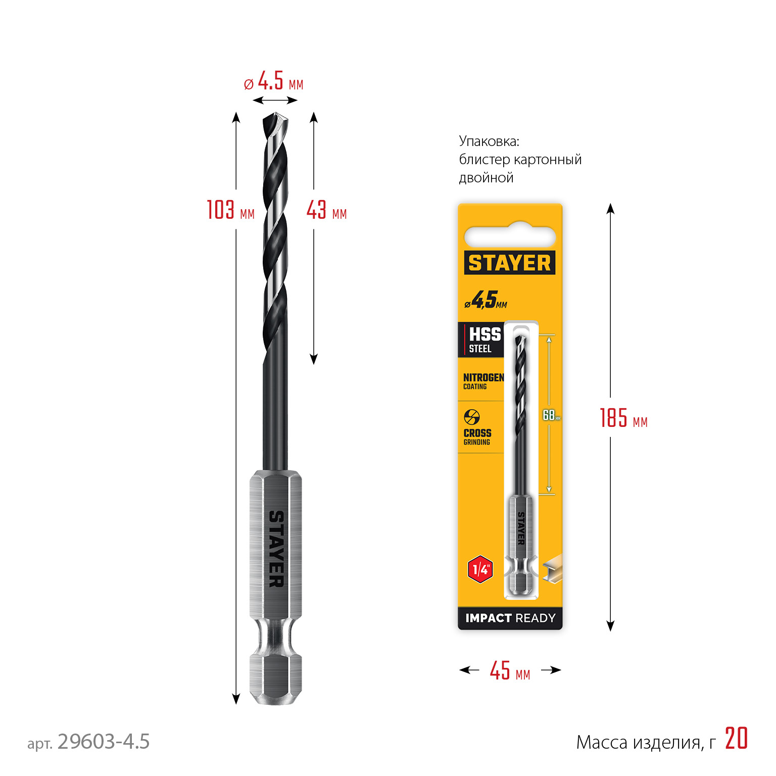 Сверло по металлу для винтовёртов и шуруповертов IMPACT READY STAYER НЕХ-1/4″, d 4.5 х 103 мм, 29603-4.5 - предназначено для обработки легированных и углеродистых сталей с пределом прочности до 800Н/мм^2, цветных металлов, серого чугуна и пластмассы.