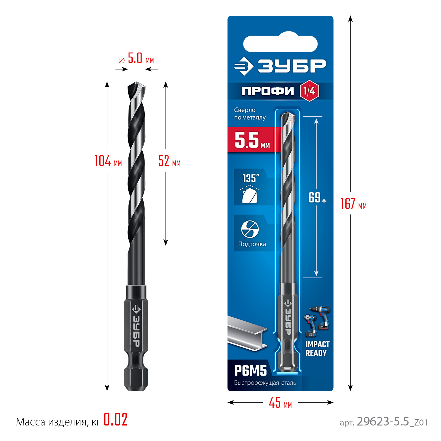 Сверло по металлу для винтовёртов и шуруповертов IMPACT READY ЗУБР НЕХ-1/4″, d 5.5 х 111 мм, 29623-5.5_z01 - предназначено для обработки легированных и углеродистых сталей с пределом прочности до 900Н/мм^2, цветных металлов, серого чугуна и пластмассы.