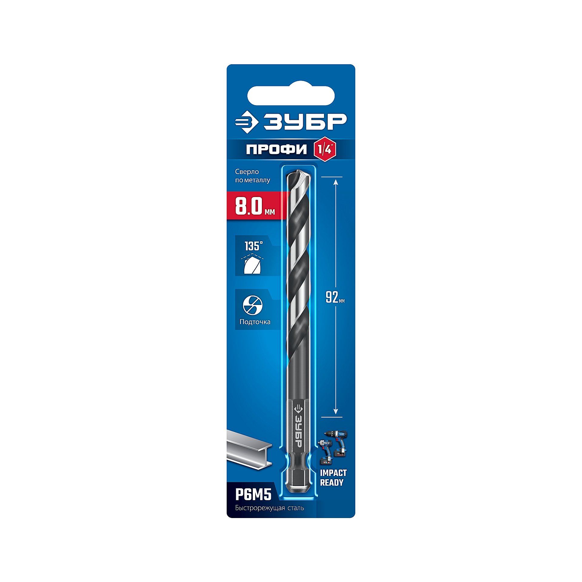 Сверло по металлу для винтовёртов и шуруповертов IMPACT READY ЗУБР НЕХ-1/4″, d 8.0 х 117 мм, 29623-8_z01 - предназначено для обработки легированных и углеродистых сталей с пределом прочности до 900Н/мм^2, цветных металлов, серого чугуна и пластмассы.
