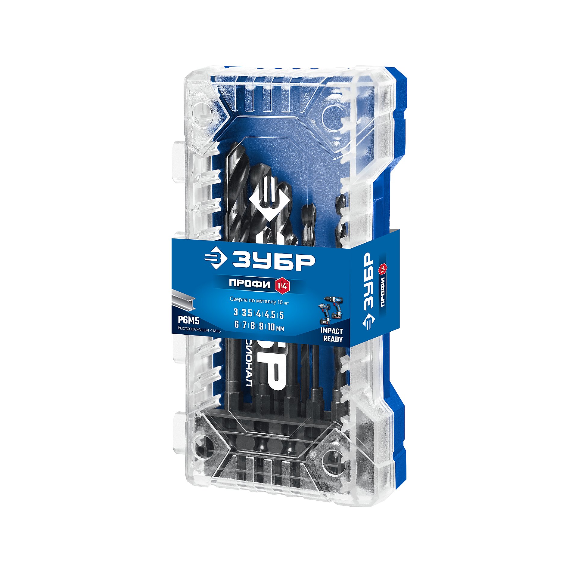 Набор сверл по металлу для винтовёртов и шуруповертов НЕХ-1/4″, 10 шт, ЗУБР IMPACT READY 29623-H10_z02 - предназначен для обработки легированных и углеродистых сталей с пределом прочности до 900Н/мм^2, цветных металлов, серого чугуна и пластмассы.