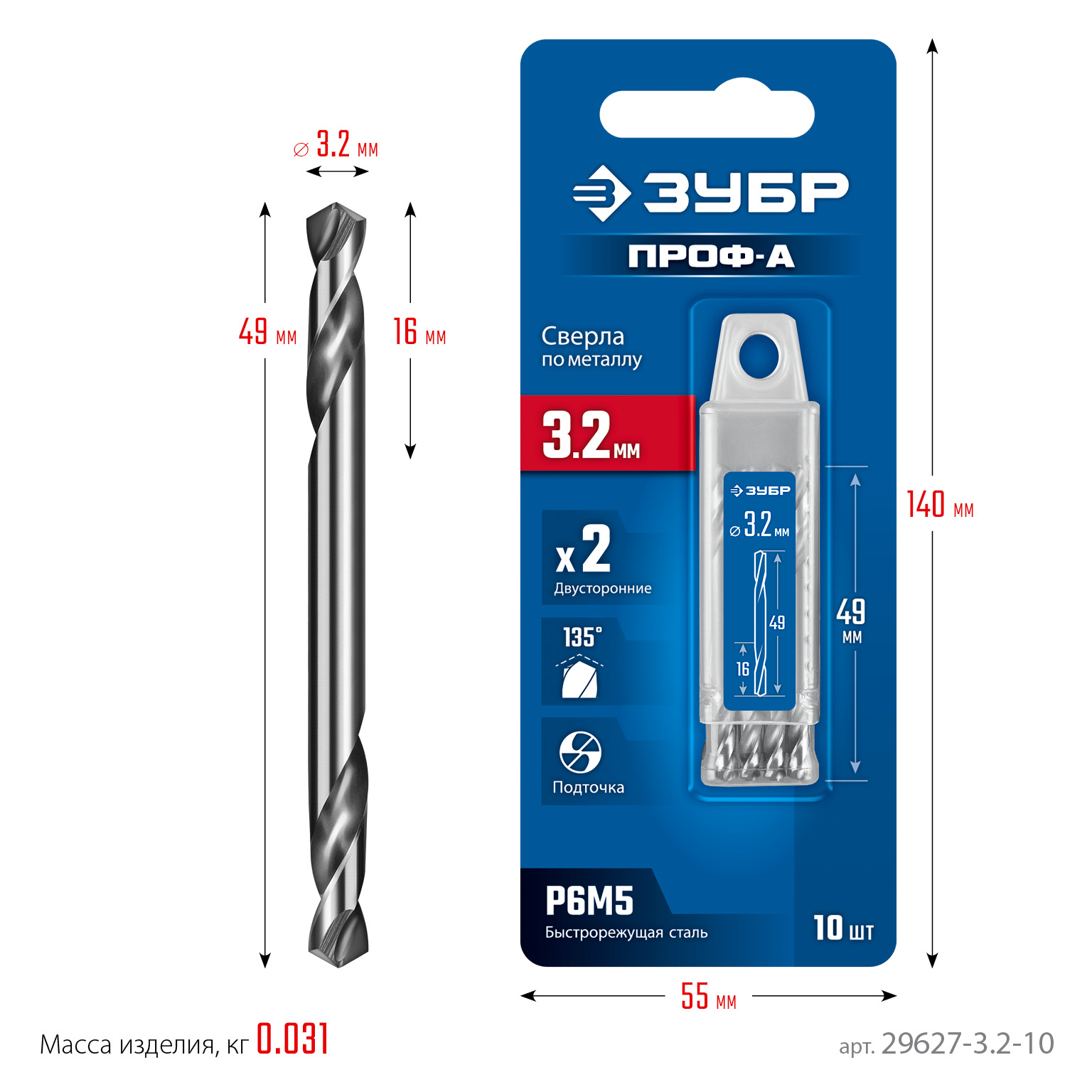 Сверло двухстороннее по металлу 3.2х49мм, Проф-А, сталь Р6М5, класс А, 10шт ЗУБР Профессионал 29627-3.2-10 - предназначено для обработки легированных и углеродистых сталей с пределом прочности до 900Н/мм^2, цветных металлов, серого чугуна и пластмассы