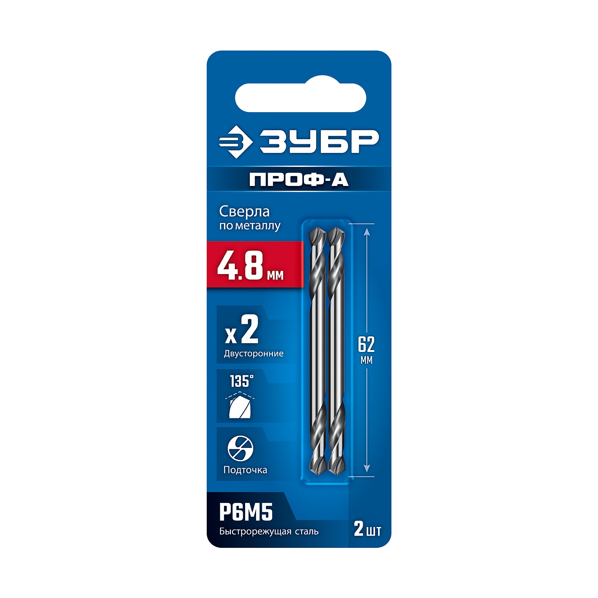 Сверло двухстороннее по металлу 4.8х62мм, Проф-А, сталь Р6М5, класс А ЗУБР Профессионал 29627-4.8 - предназначено для обработки легированных и углеродистых сталей с пределом прочности до 900Н/мм^2, цветных металлов, серого чугуна и пластмассы