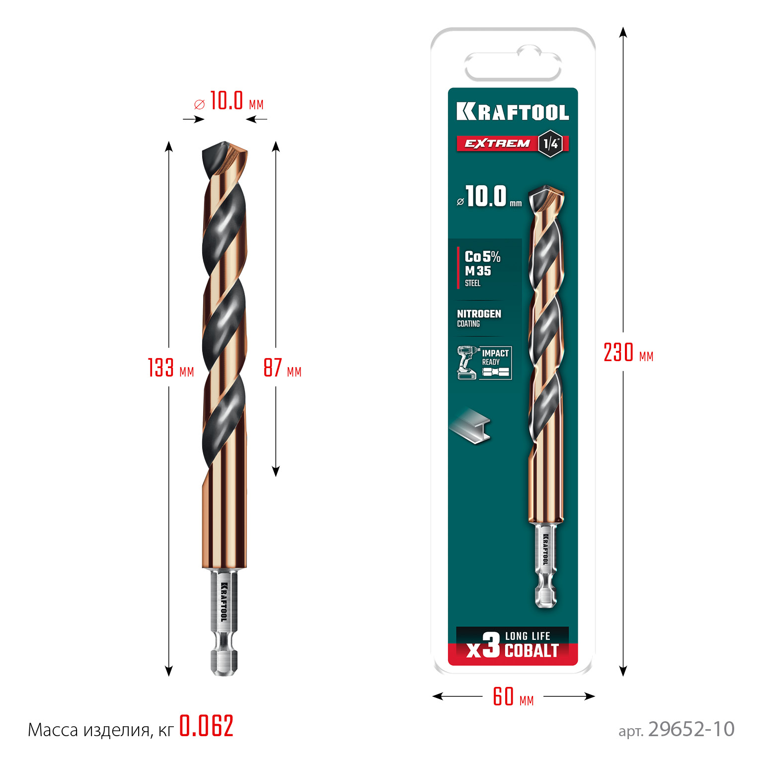 Сверло по металлу для винтовёртов и шуруповертов НЕХ-1/4″, d 10.0 х 133 мм, KRAFTOOL IMPACT READY 29652-10 - предназначено для обработки легированных и углеродистых сталей с пределом прочности до 1000Н/мм^2, цветных металлов, серого чугуна и пластмассы.