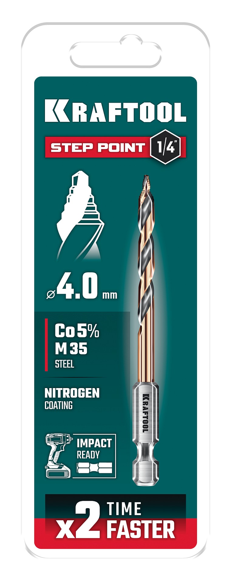 Сверло по металлу для винтовёртов и шуруповертов IMPACT READY KRAFTOOL STEP POINT, d 4.0 × 83 мм, 29653-4 — предназначено для обработки легированных и углеродистых сталей с пределом прочности до 1000 Н/мм², цветных металлов, серого чугуна и пластмассы.