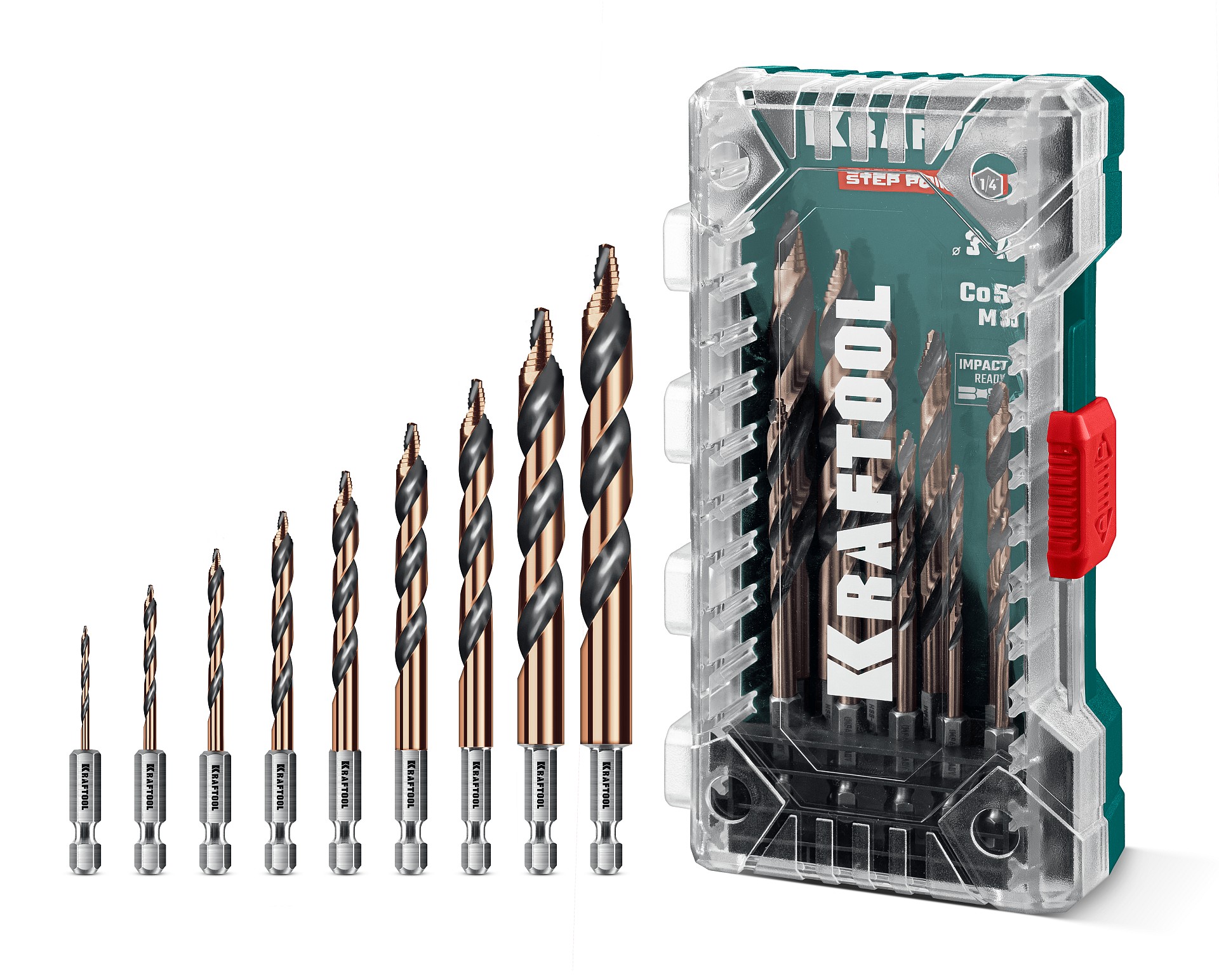 Набор сверл по металлу для винтовёртов и шуруповертов IMPACT READY KRAFTOOL STEP POINT, 10 шт, 29653-H10 — предназначен для обработки легированных и углеродистых сталей с пределом прочности до 1000 Н/мм², цветных металлов, серого чугуна и пластмассы.