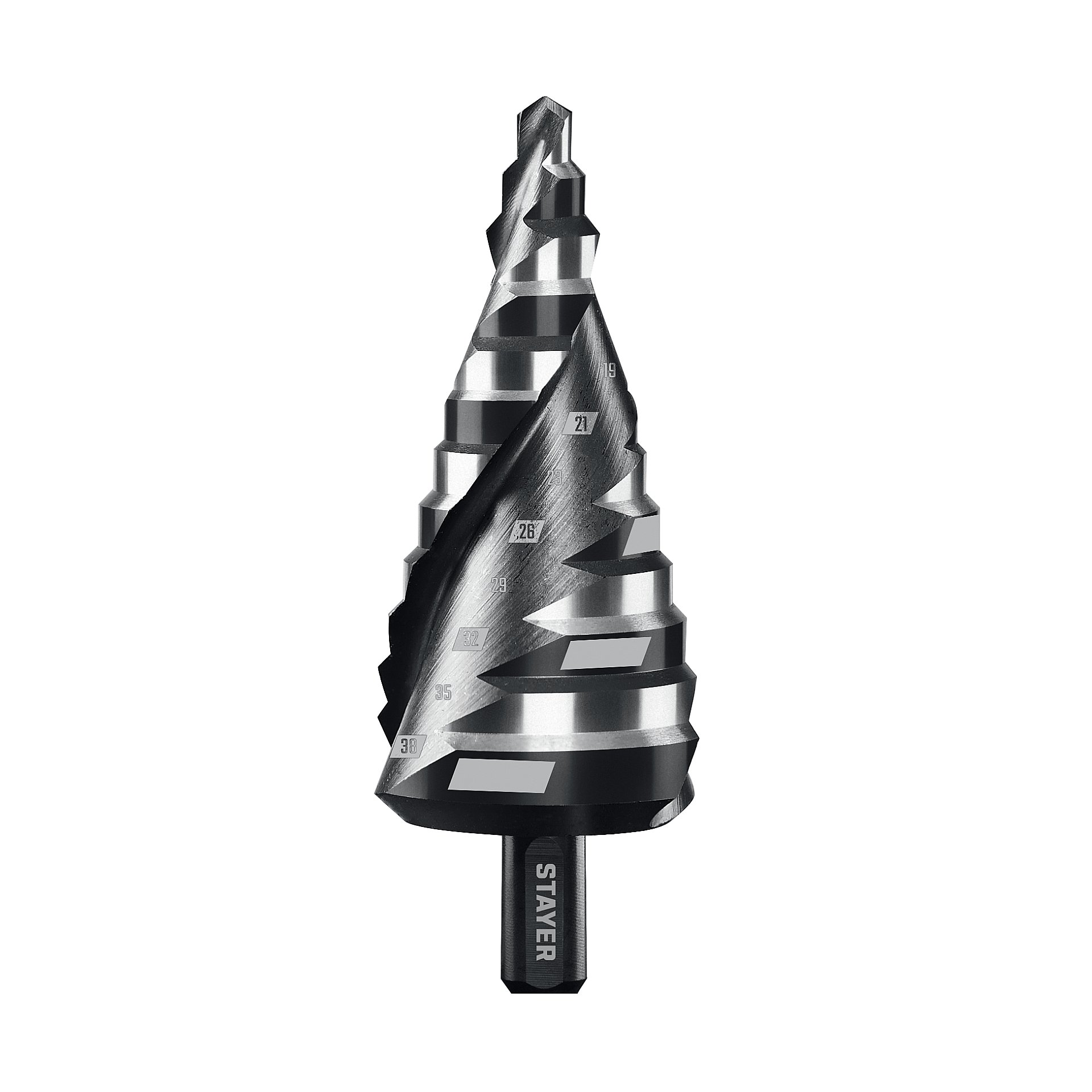 Сверло ступенчатое STAYER Pro-Max 6-38мм, 12 ступеней, винтовая спираль, 29661-6-38-12 - предназначено для сверления металлических конструкций и заготовок, листовых материалов, цветных металлов, пластика. Множество диаметров в одном сверле для сверления различных листовых материалов.