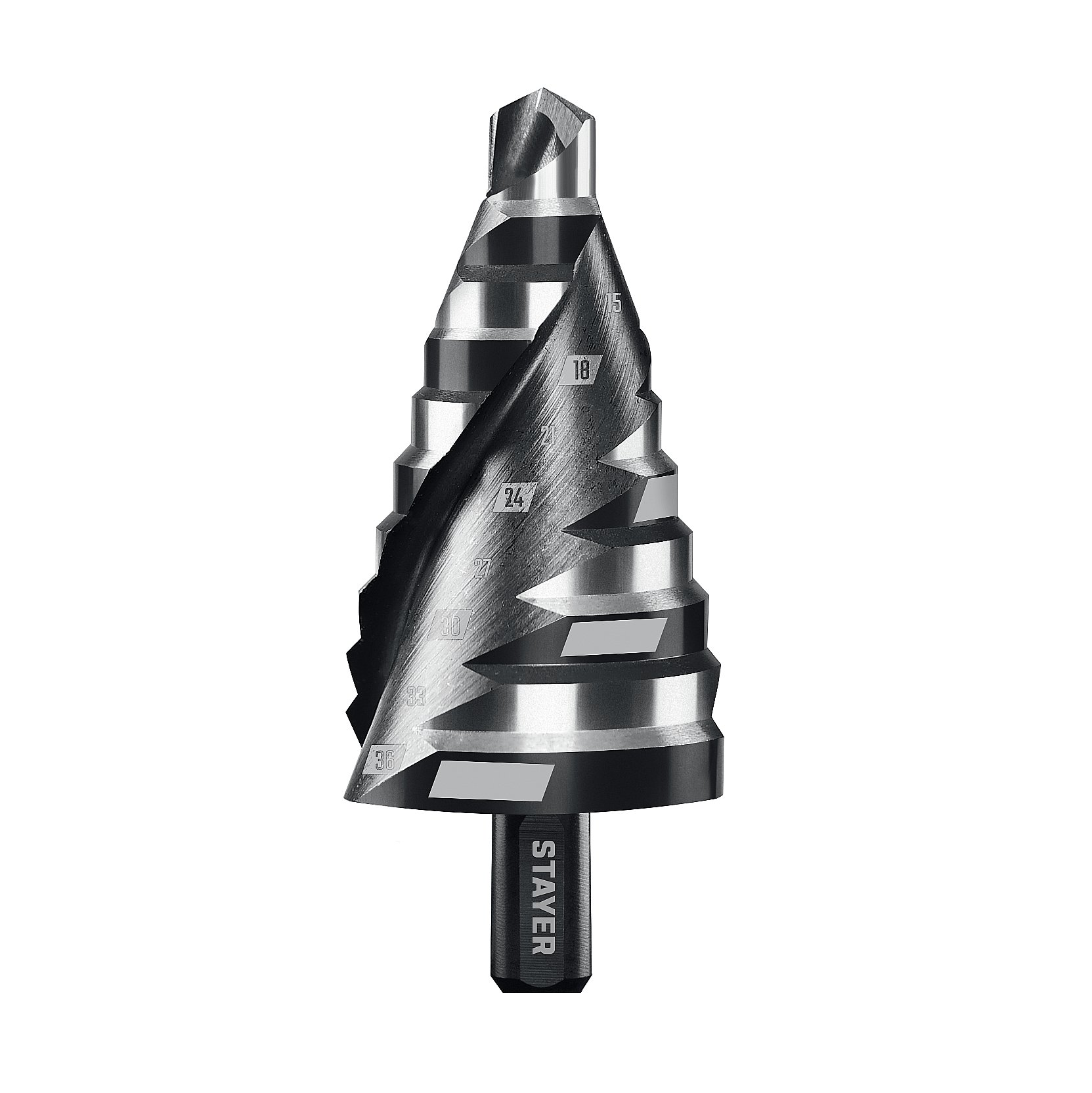Сверло ступенчатое STAYER Pro-Max 9-36мм, 10 ступеней, винтовая спираль, 29661-9-36-10 - предназначено для сверления металлических конструкций и заготовок, листовых материалов, цветных металлов, пластика. Множество диаметров в одном сверле для сверления различных листовых материалов.