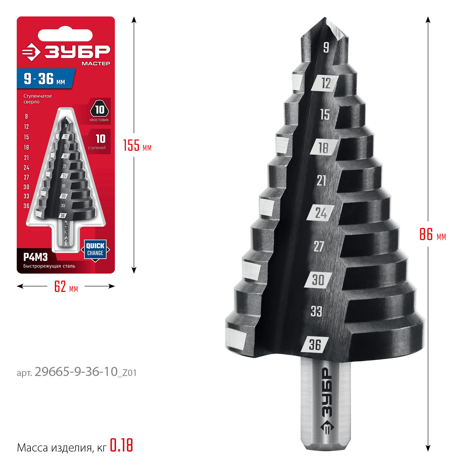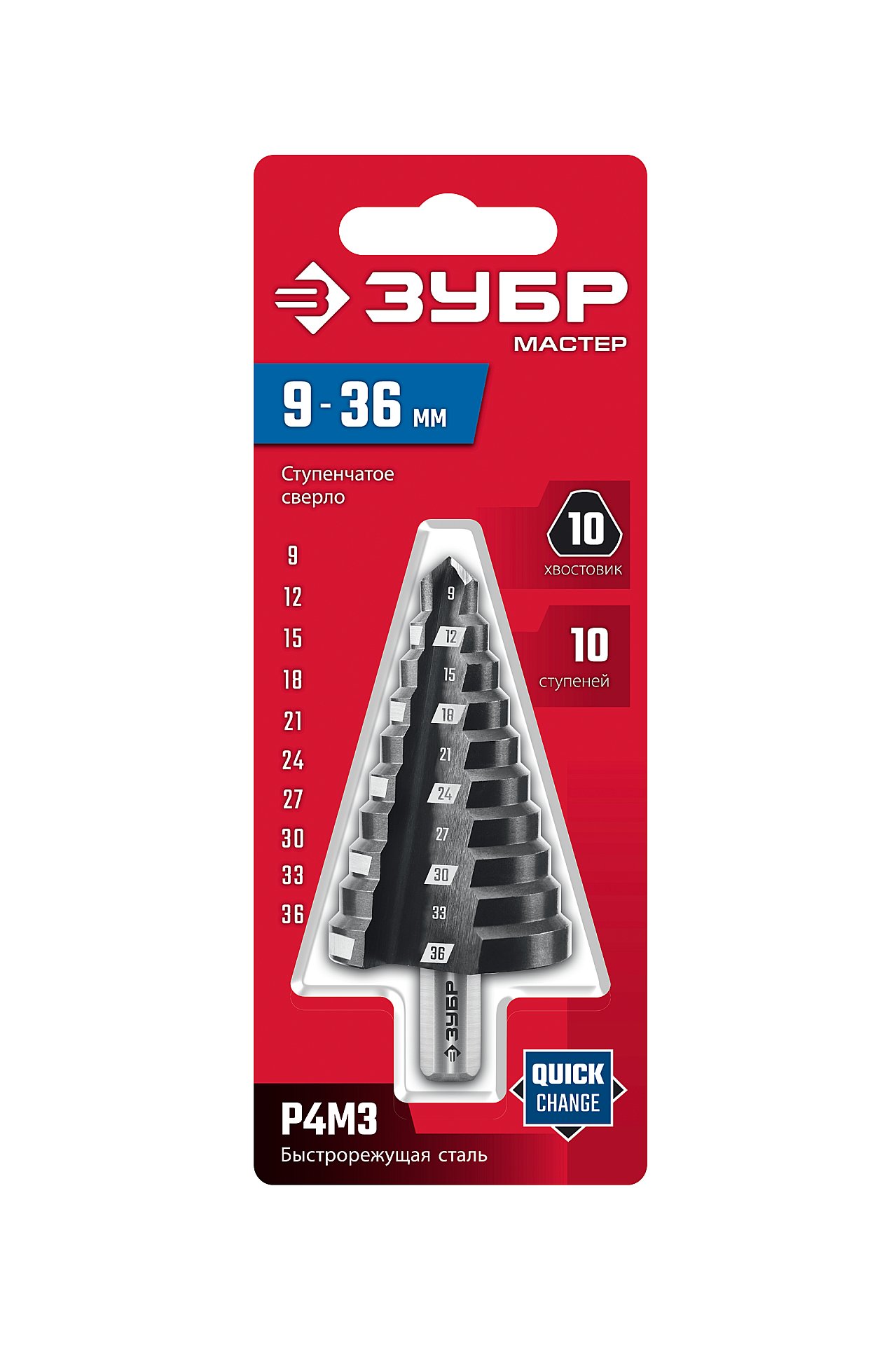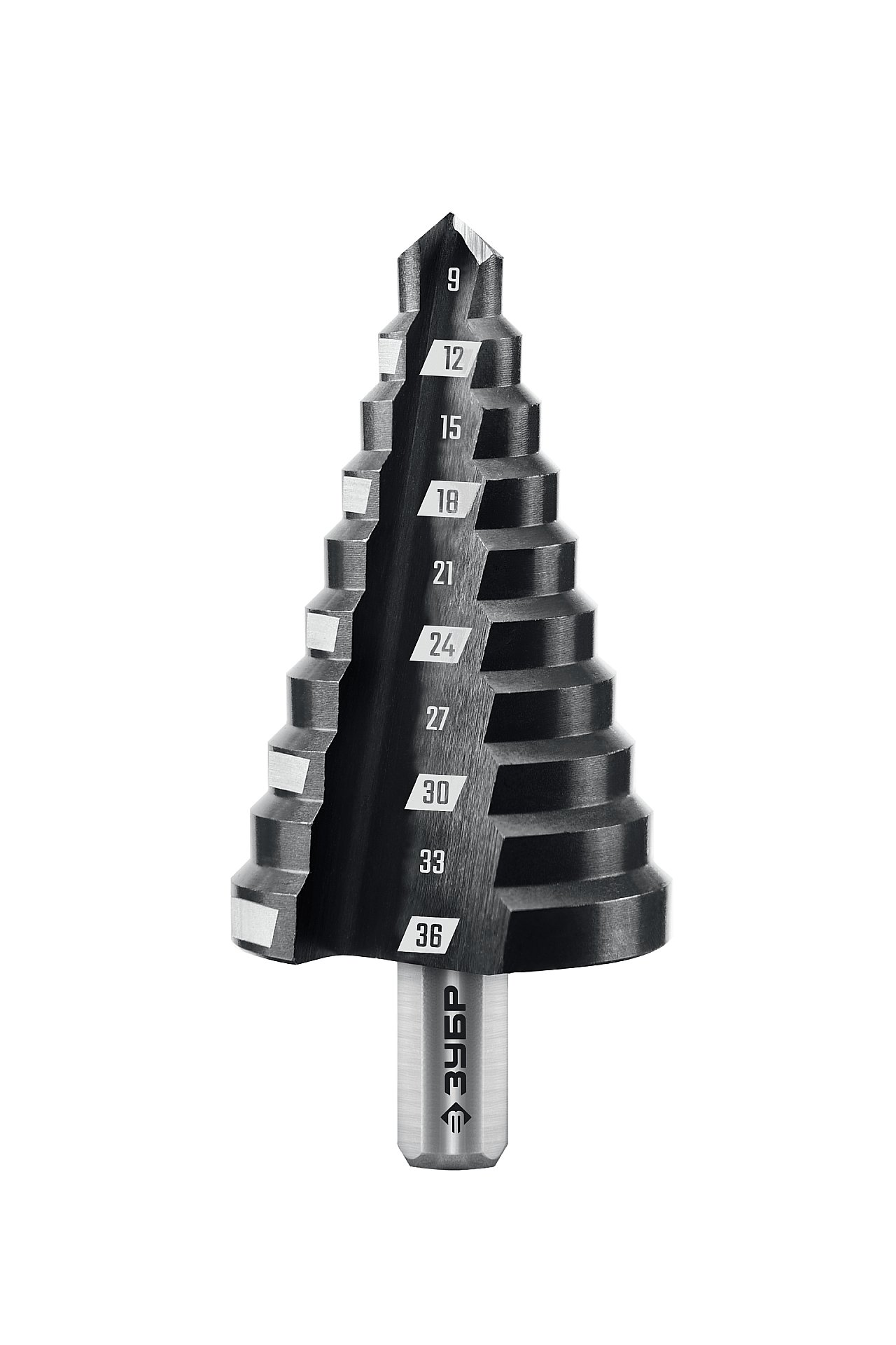 Сверло ступенчатое ЗУБР 9-36мм, 10 ступеней, 29665-9-36-10_z01 - предназначено для сверления металлических конструкций и заготовок, листовых материалов, цветных металлов, пластика. Множество диаметров в одном сверле для сверления различных листовых материалов.