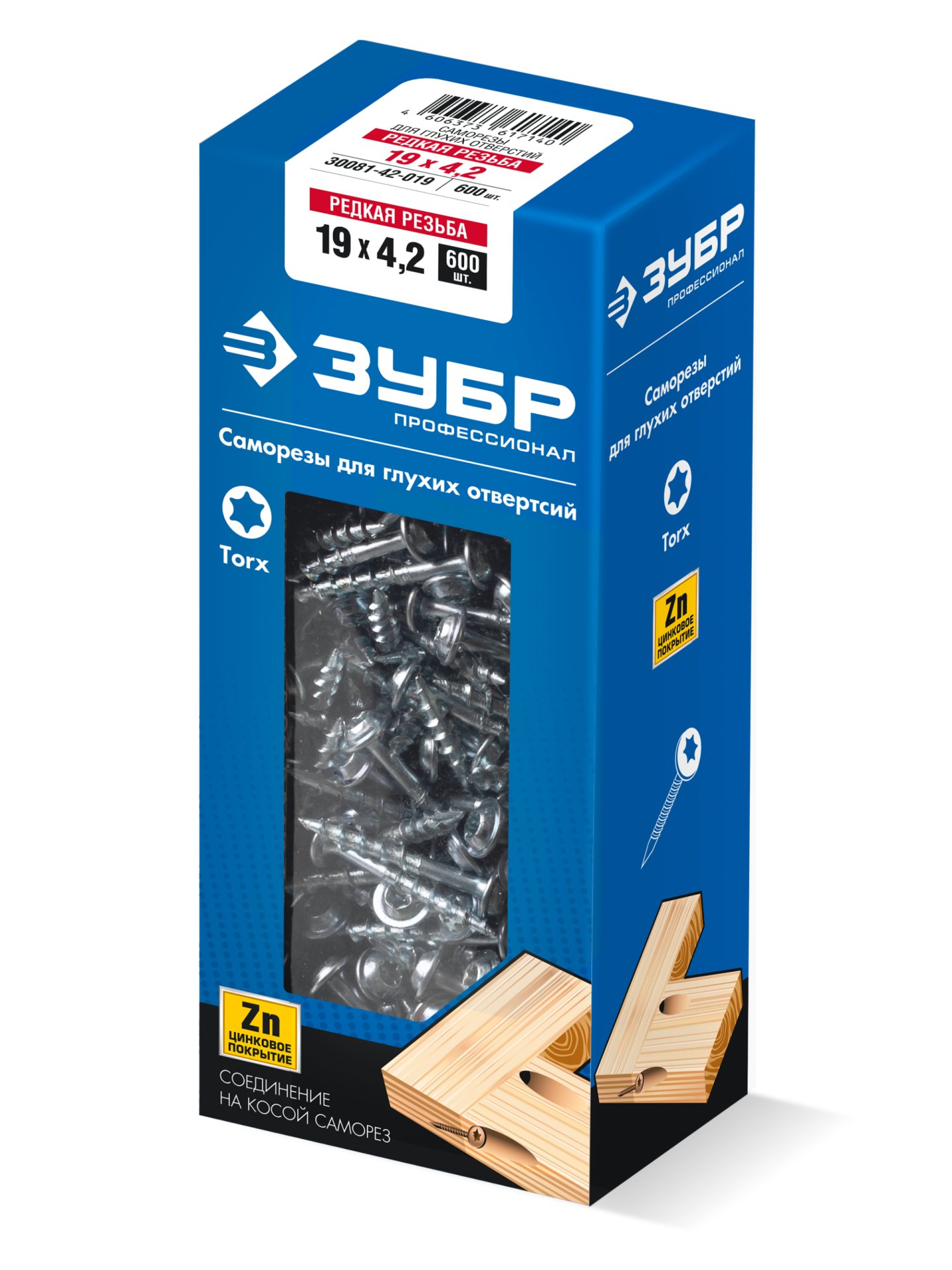 Саморез для глухих отверстий ЗУБР 19 х 4.2 мм, редкая резьба, ТХ20, цинк, 600 шт, Профессионал 30081-42-019 - предназначены для соединения деталей через глухие отверстия, для соединения деталей из мягких пород дерева, не допуская крошения волокнистой стуктуры.