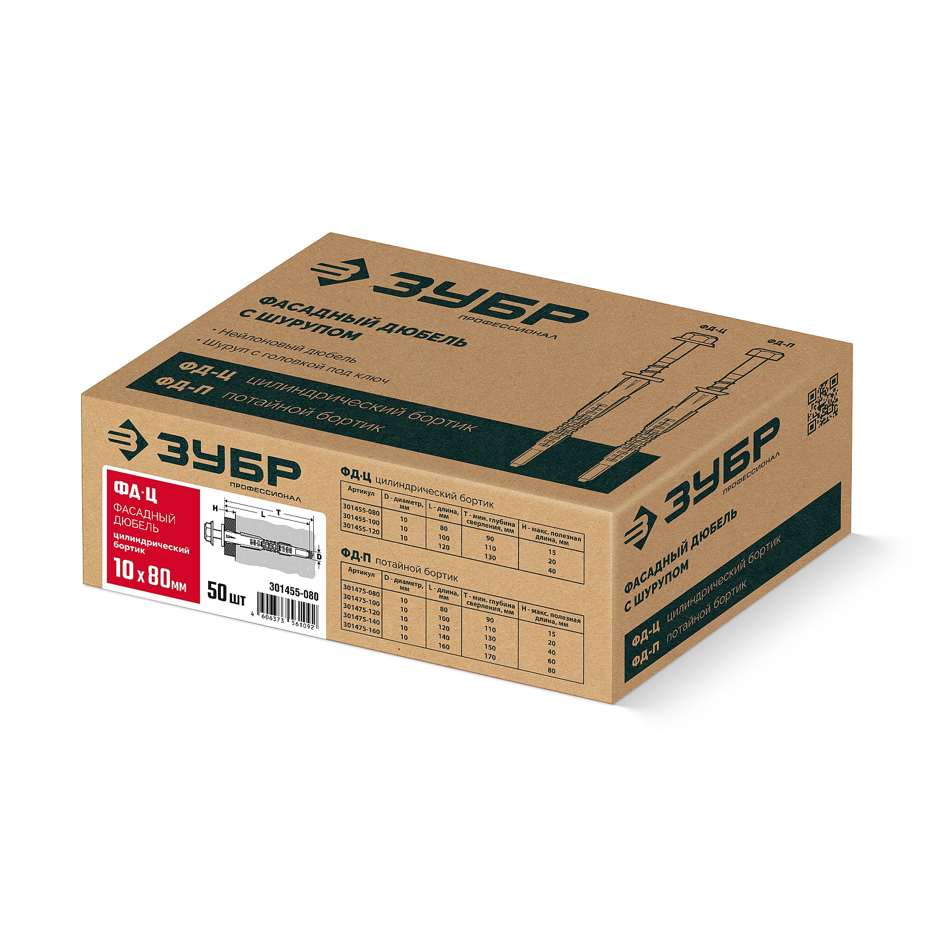 Фасадный дюбель, нейлон/цинк, ЗУБР ФД-Ц 10 x 80 мм, 50 шт 301455-080 - применяется для крепления фасадных и кровельных конструкций, окон и дверных блоков, ограждений и т.п. к полнотелым строительным материалам (бетон, строительный камень, кирпич).
