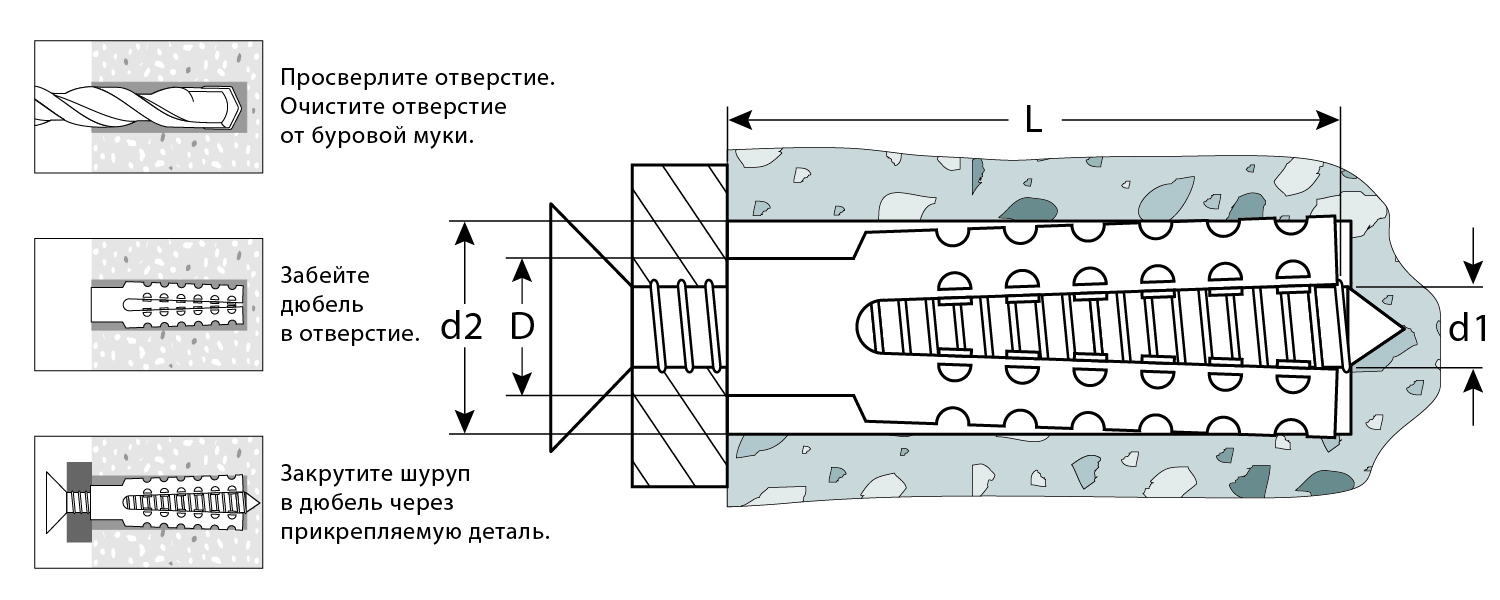 Простота установки - дюбель вставляется в предварительно просверленное отверстие и расклинивается при вкручивании шурупа.