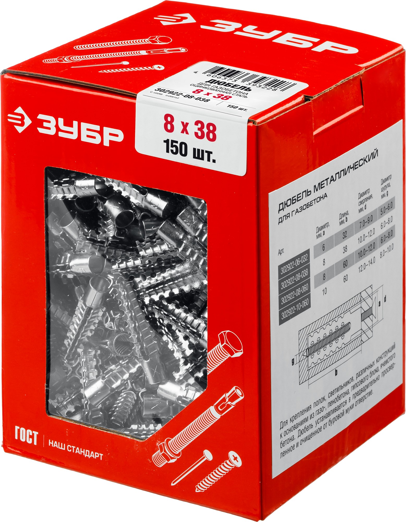 Дюбель металлический для газобетона ЗУБР 8 x 38 мм, 150 шт 302922-08-038 - применяется для крепления различных элементов конструкций и предметов интерьера к газобетонным основаниям.