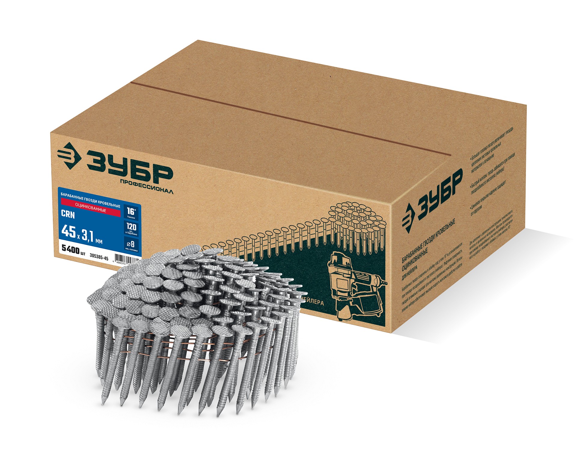 Барабанные гвозди кровельные оцинкованные, CRN 45 х 3.1 мм, 5400 шт ЗУБР 305385-45 - предназначены для крепления к деревянным конструкциям тонколистового металла и кровельных материалов.