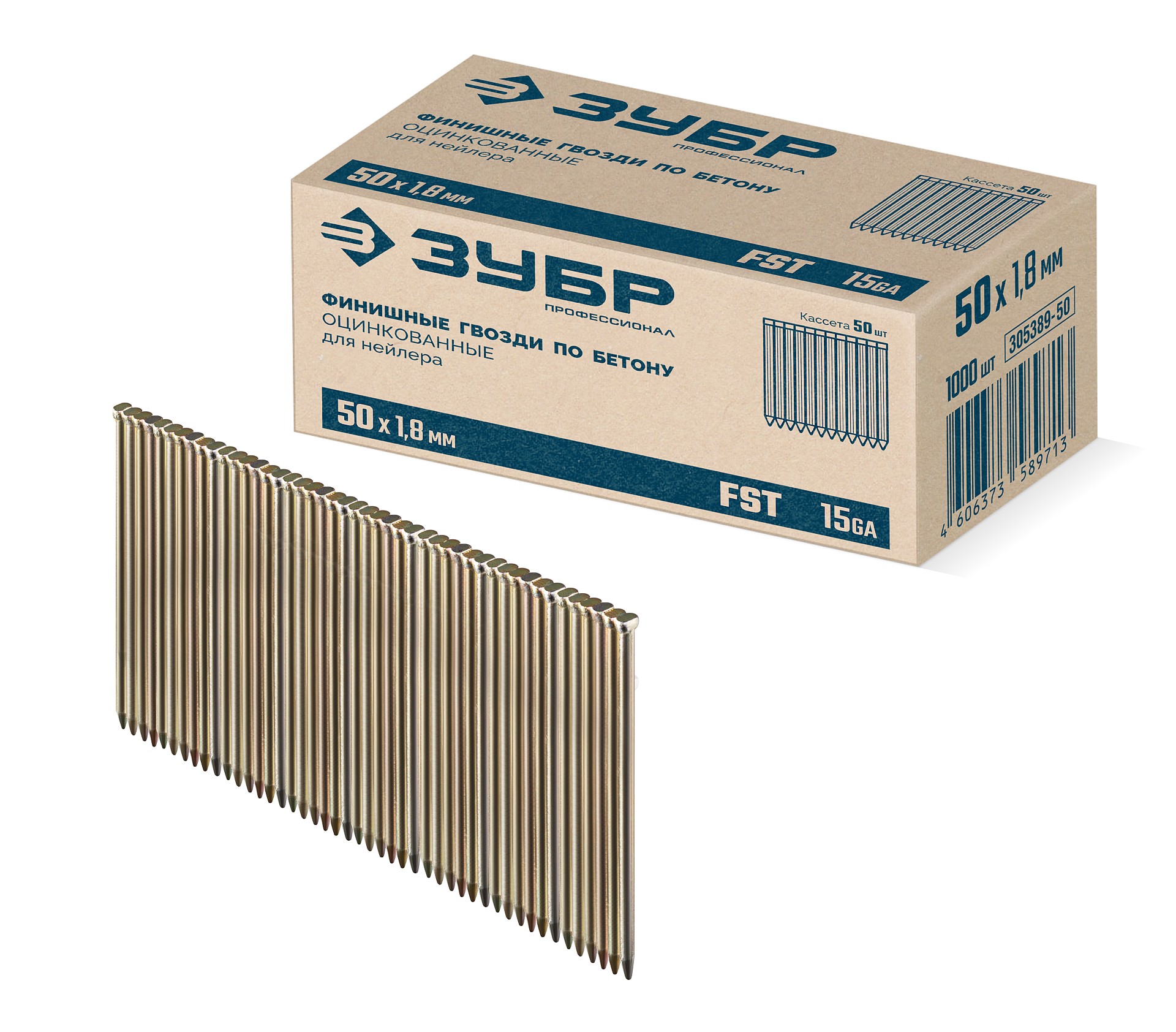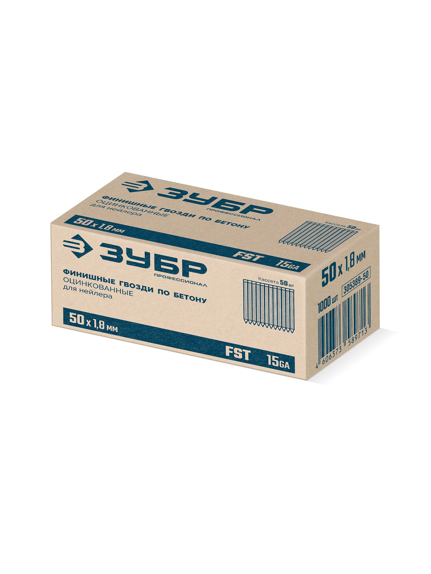 Финишные гвозди по бетону оцинкованные, калибр 15GA, FST 50 х 1.8 мм, 1000 шт ЗУБР 305389-50 - используют при общестроительных работах: для крепления фанеры к бетону, тонких металлических и алюминиевых направляющих — к бетону и кирпичу, профлиста — к бетону, кирпичу и металлическим балкам.