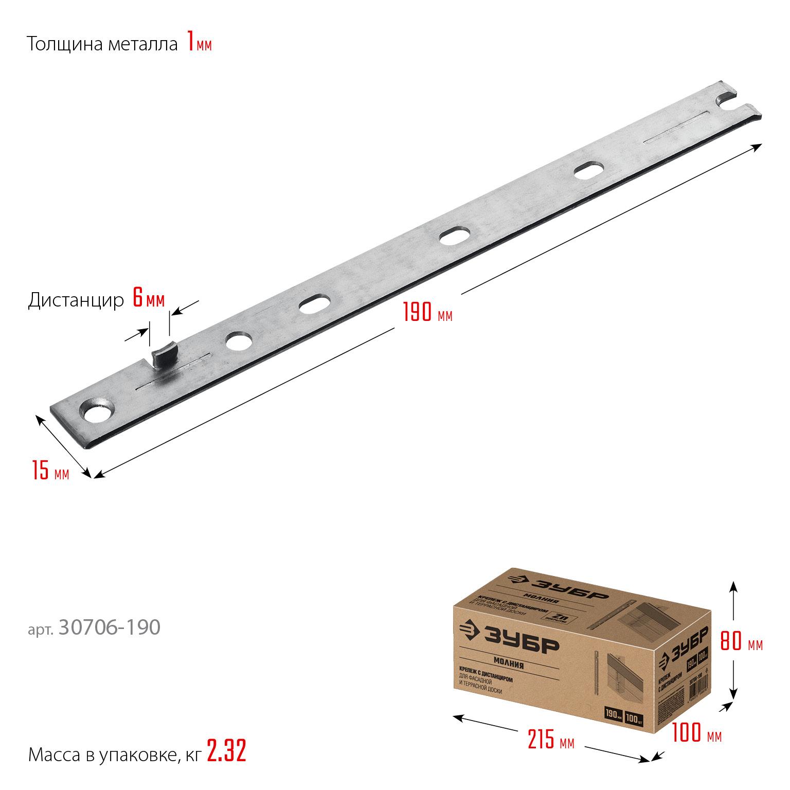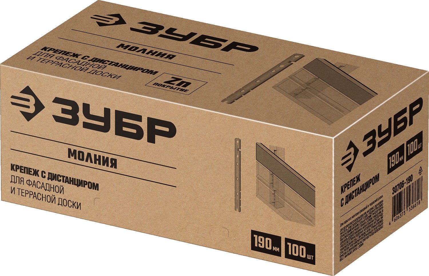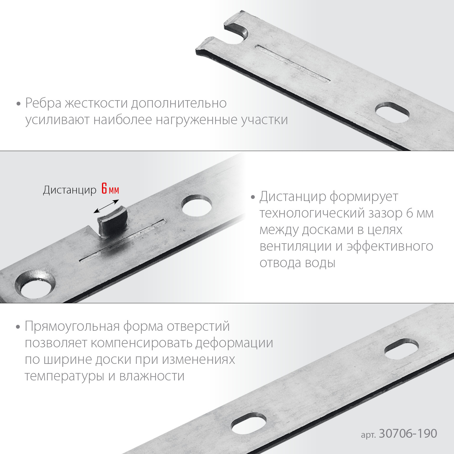 Крепеж с дистанциром ЗУБР для фасадной и террасной доски, 190мм, 100 шт., оцинкованный, Молния 30706-190 - предназначен для существенного ускорения и облегчения проведения отделочных работ, обладая при этом рядом преимуществ по сравнению с традиционным креплением при помощи гвоздей.