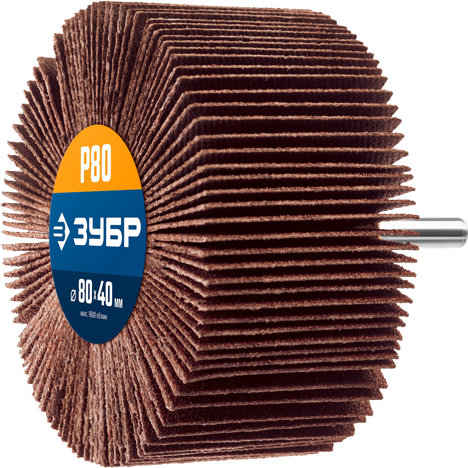 Круг шлифовальный лепестковый ЗУБР d 80 x 40 мм, P80, на шпильке d 6 мм, Профессионал арт. 36604-080_z01 - применяется для шлифовальных работ на электродрелях и шуруповертах в безударном режиме при обработке металла, древисины, пластика и других материалов.
