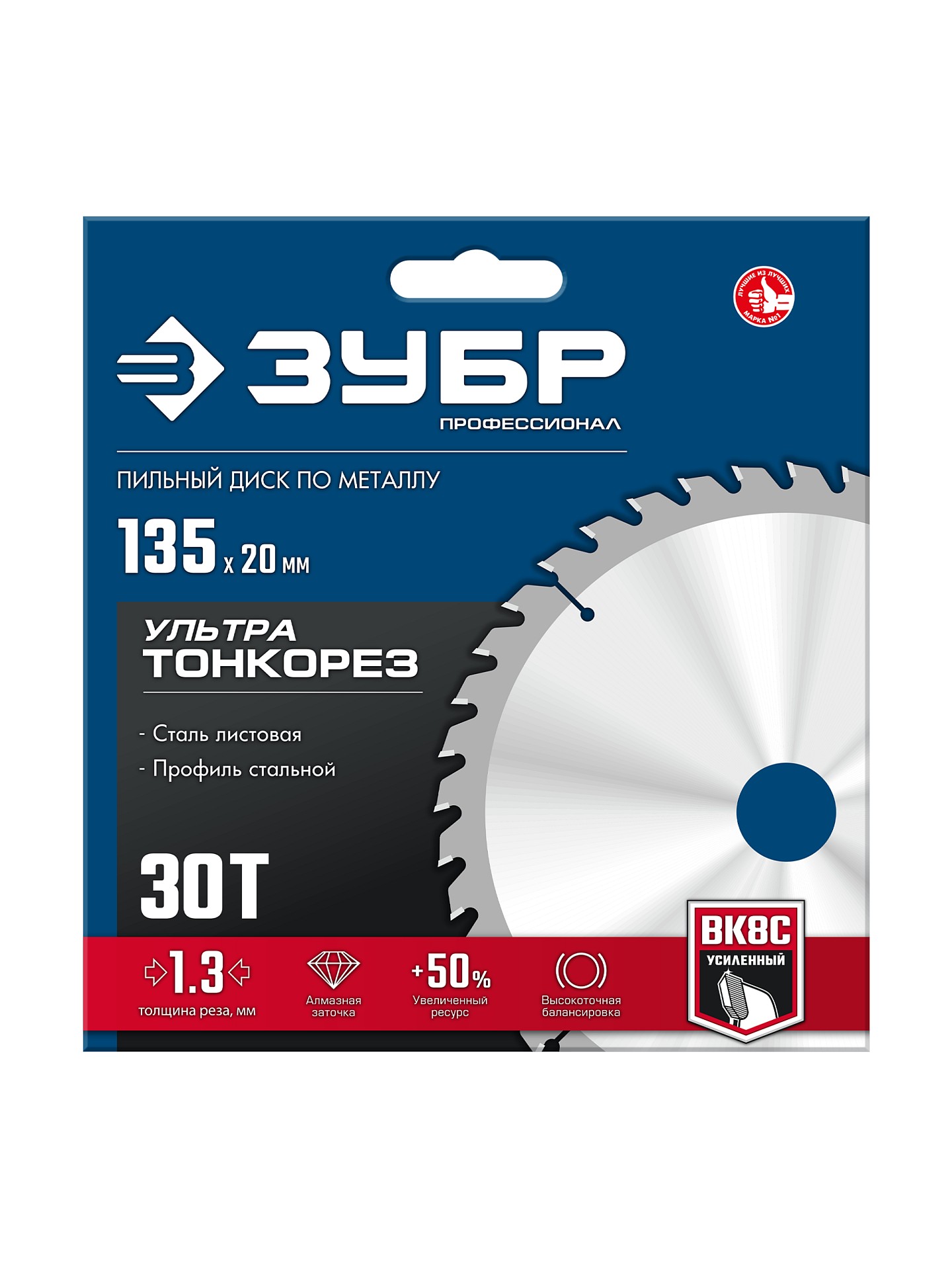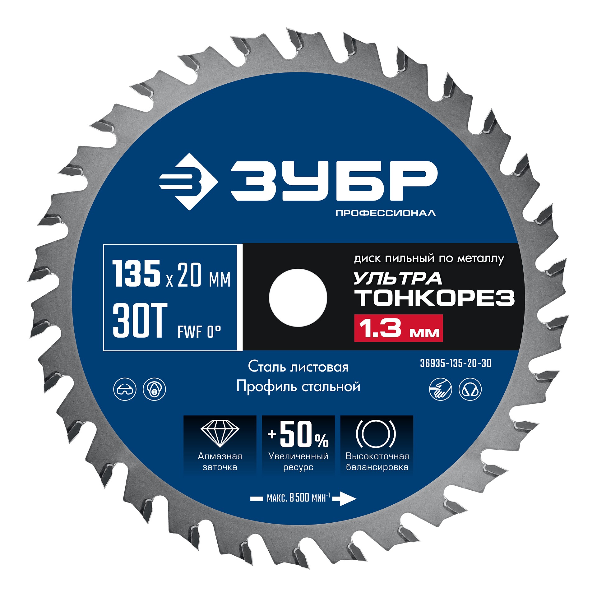 Диск пильный ЗУБР Ультра Тонкорез 135 х 20 x 1.3 мм, 30Т, тонкий рез металла, Профессионал арт. 36935-135-20-30 - используется для продольного, поперечного и углового распила металла, сталей и металлопрофиля на циркулярных, торцовочных и станковых пилах.