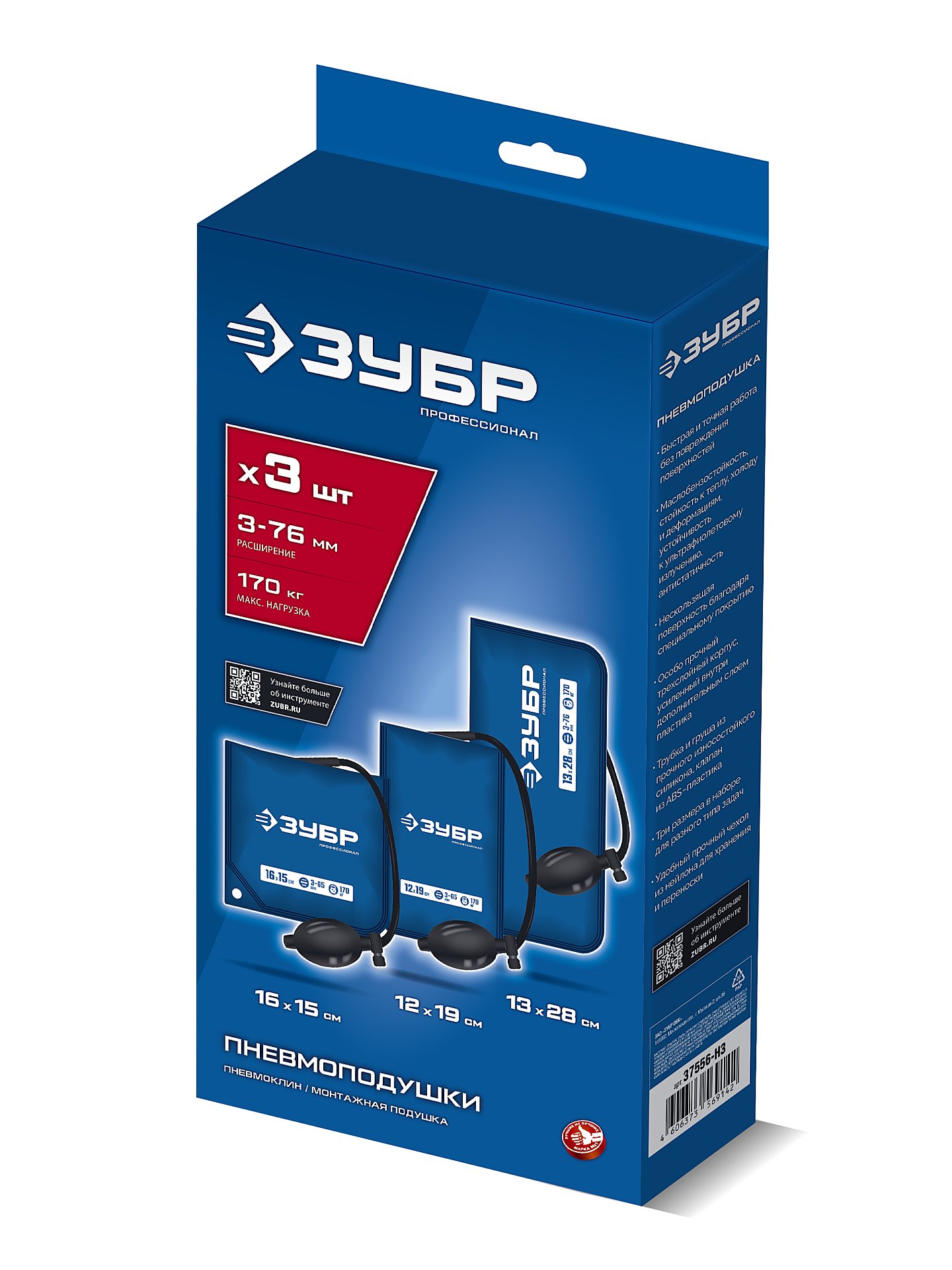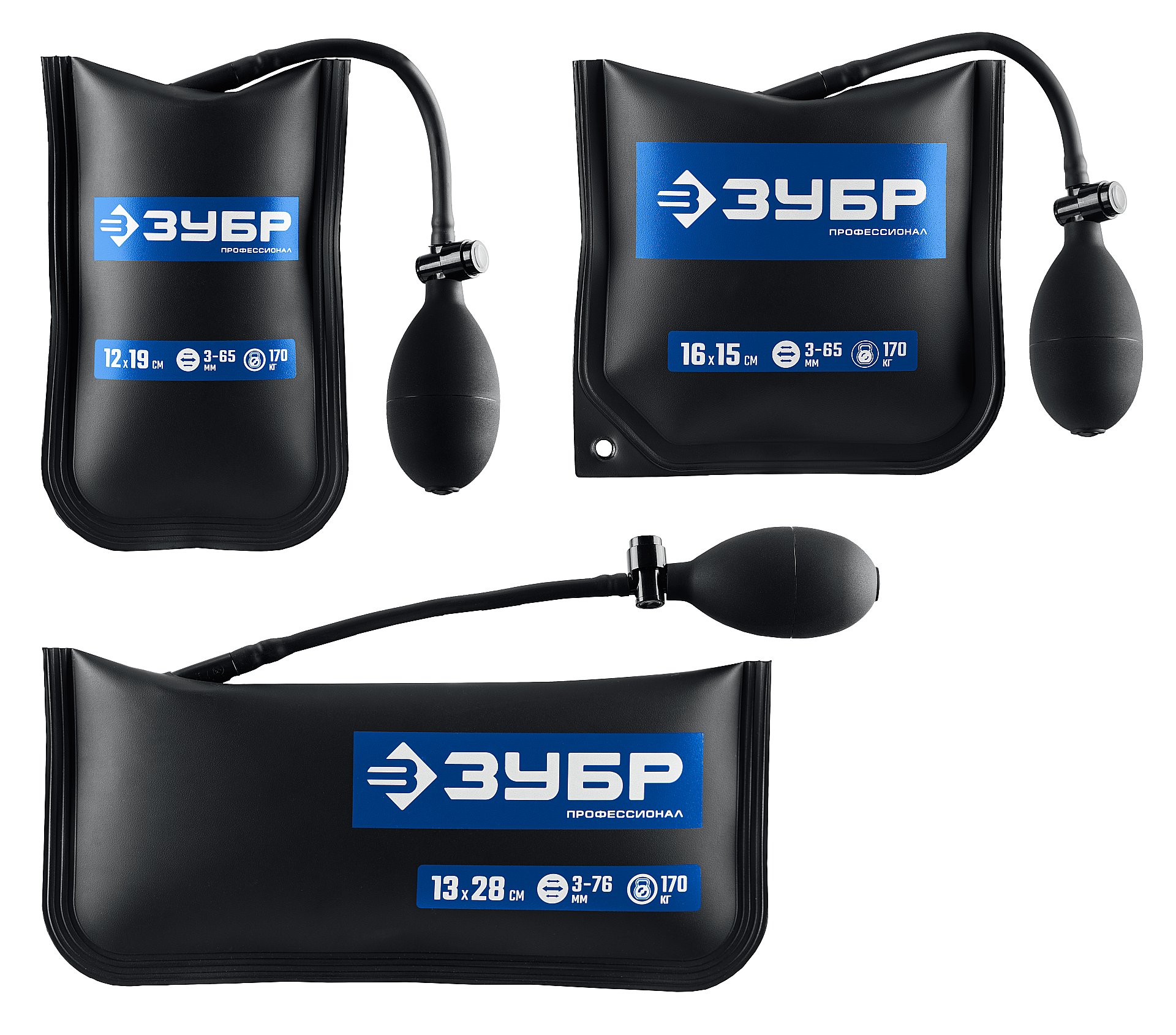 ПНЕВМОПОДУШКА набор 3шт: 12х19, 16х15, 13х28 см, 170кг, в чехле, универсальный пневмоклин/ монтажная подушка/ пневмодомкрат ЗУБР 37556-Н3 - предназнечена для подъема тяжелых предметов.