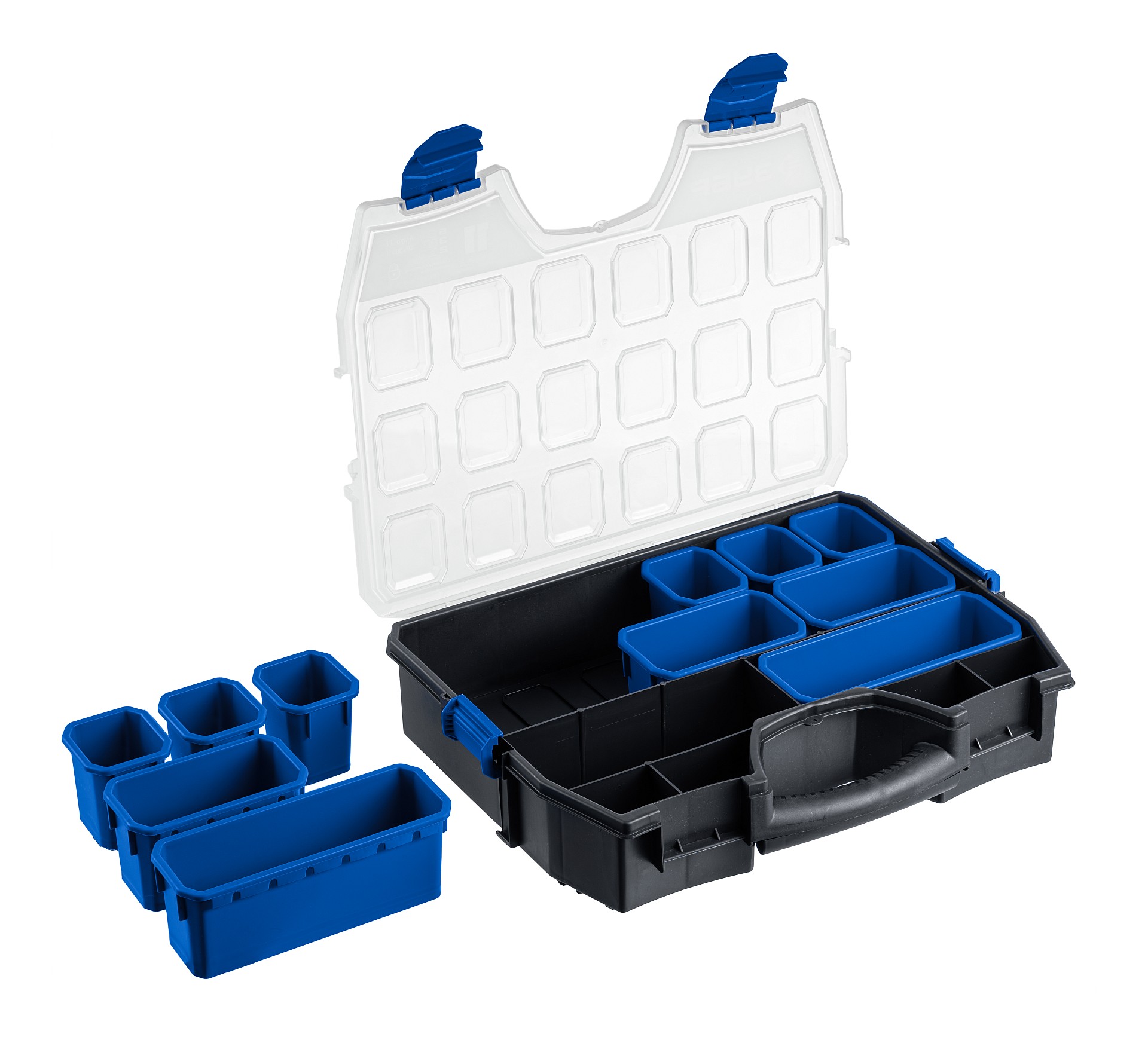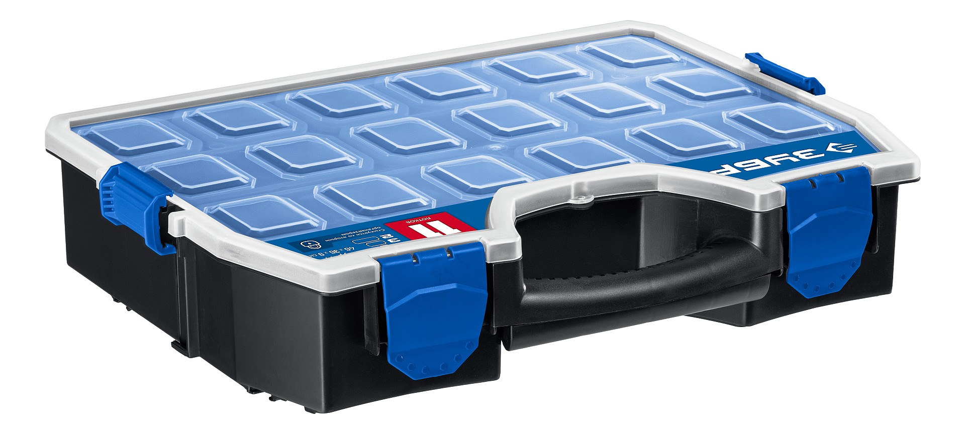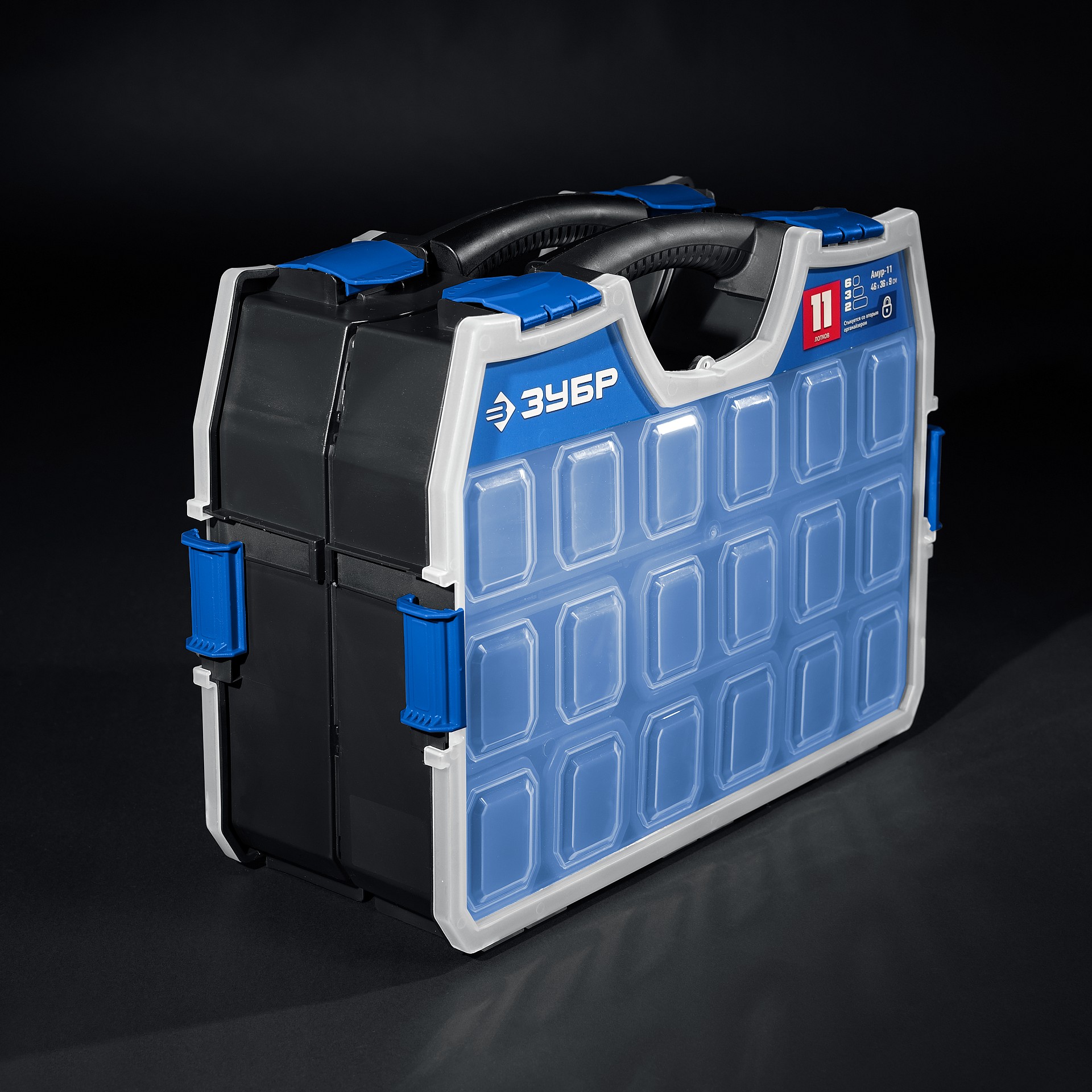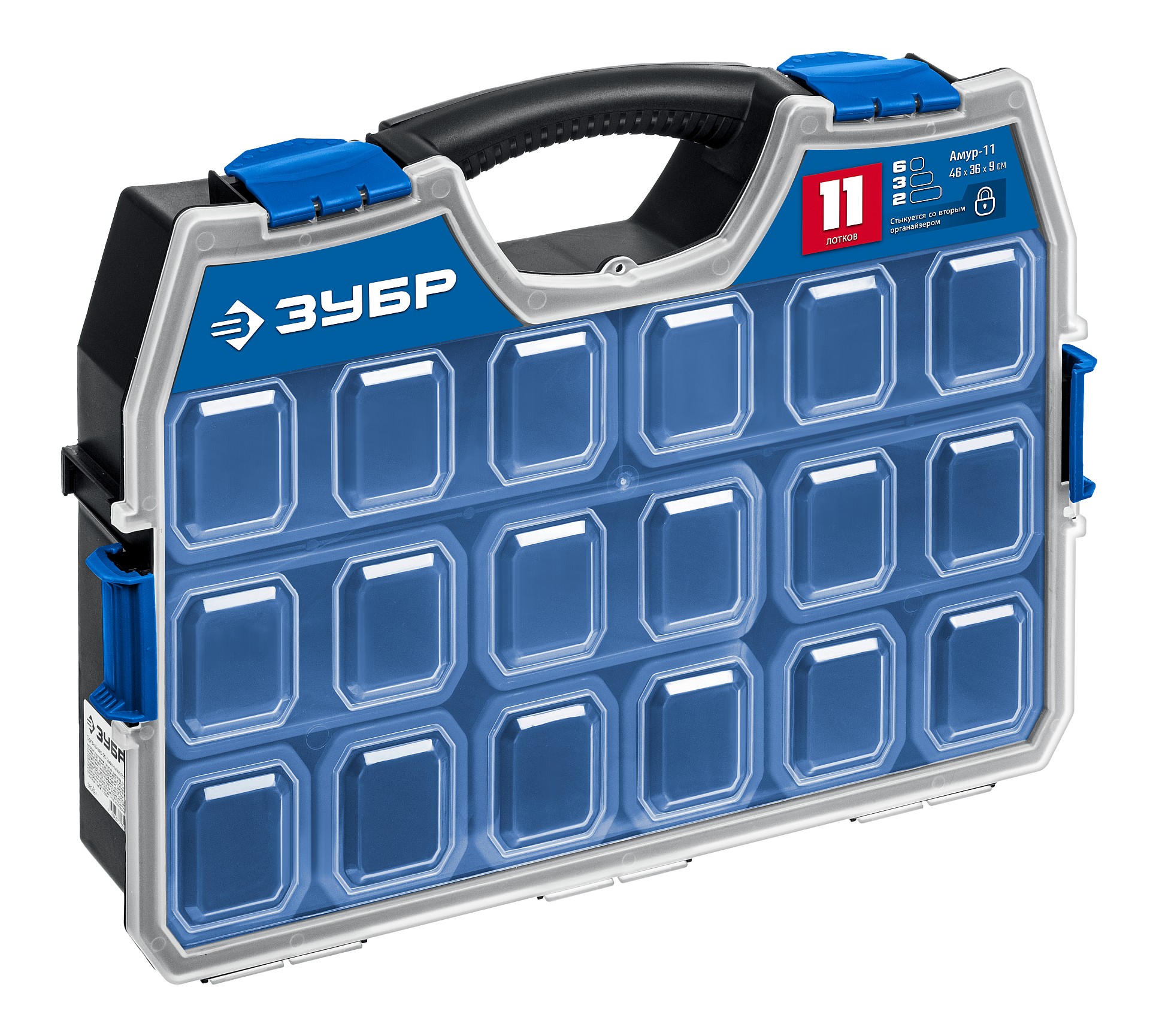 Пластиковый органайзер со съемными лотками ЗУБР АМУР-11, 462 х 365 х 92 мм 38042-11 - применяется для хранения мелких предметов и метизов. Пылевлагозащитная резинка. Надежное запирание органайзера с 3-х сторон.