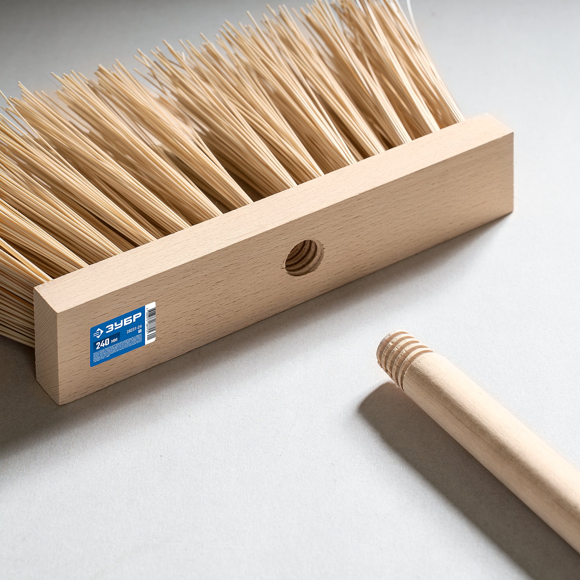 Метла с черенком ЗУБР ДОКА буковая колодка 24см, шлифованный берёзовый черенок 120см (d22мм), щетина 120мм, 3-рядная 39231-24_z01 - предназначена для уборки улиц. Щетина полиэтилентерефталат Размер колодки 24х5см