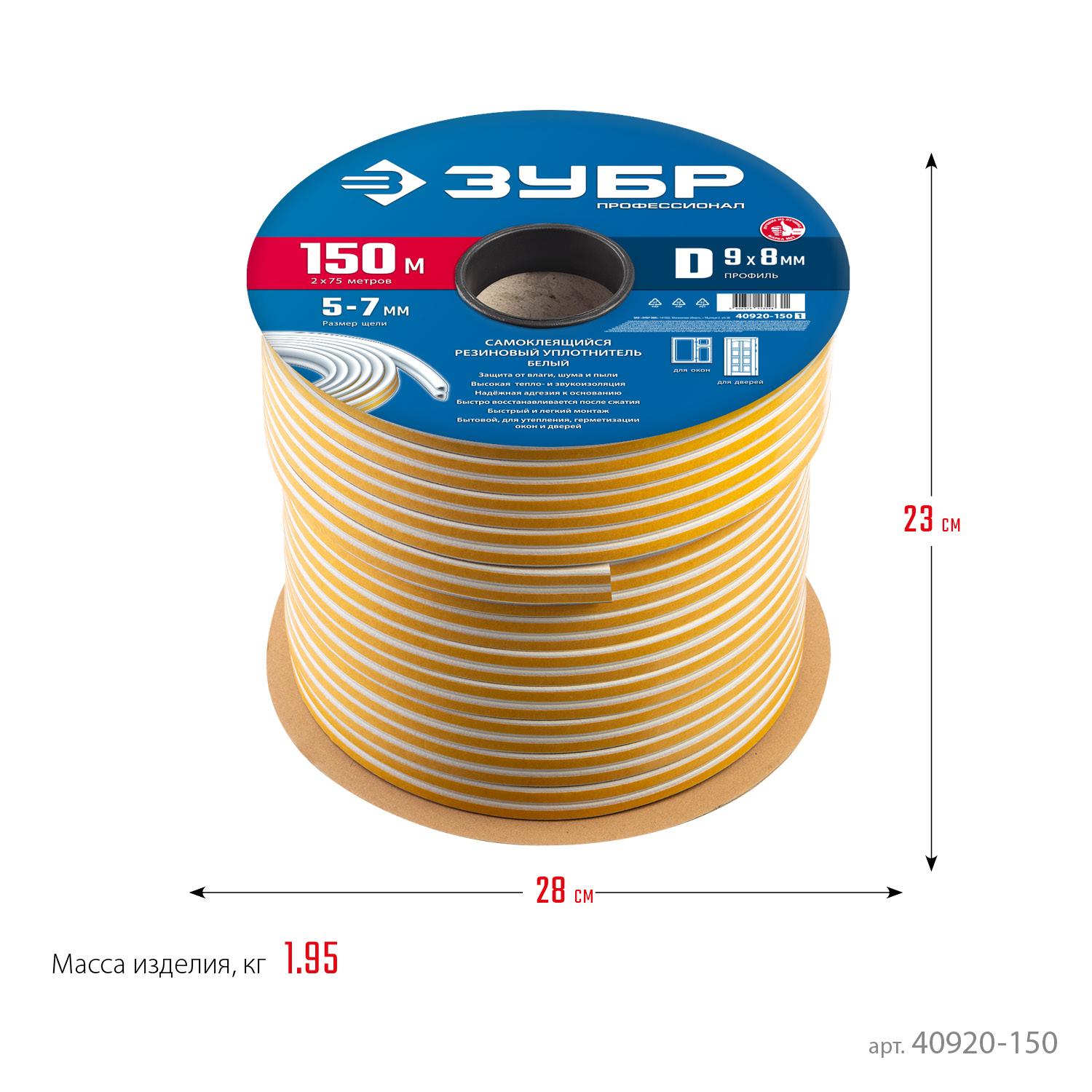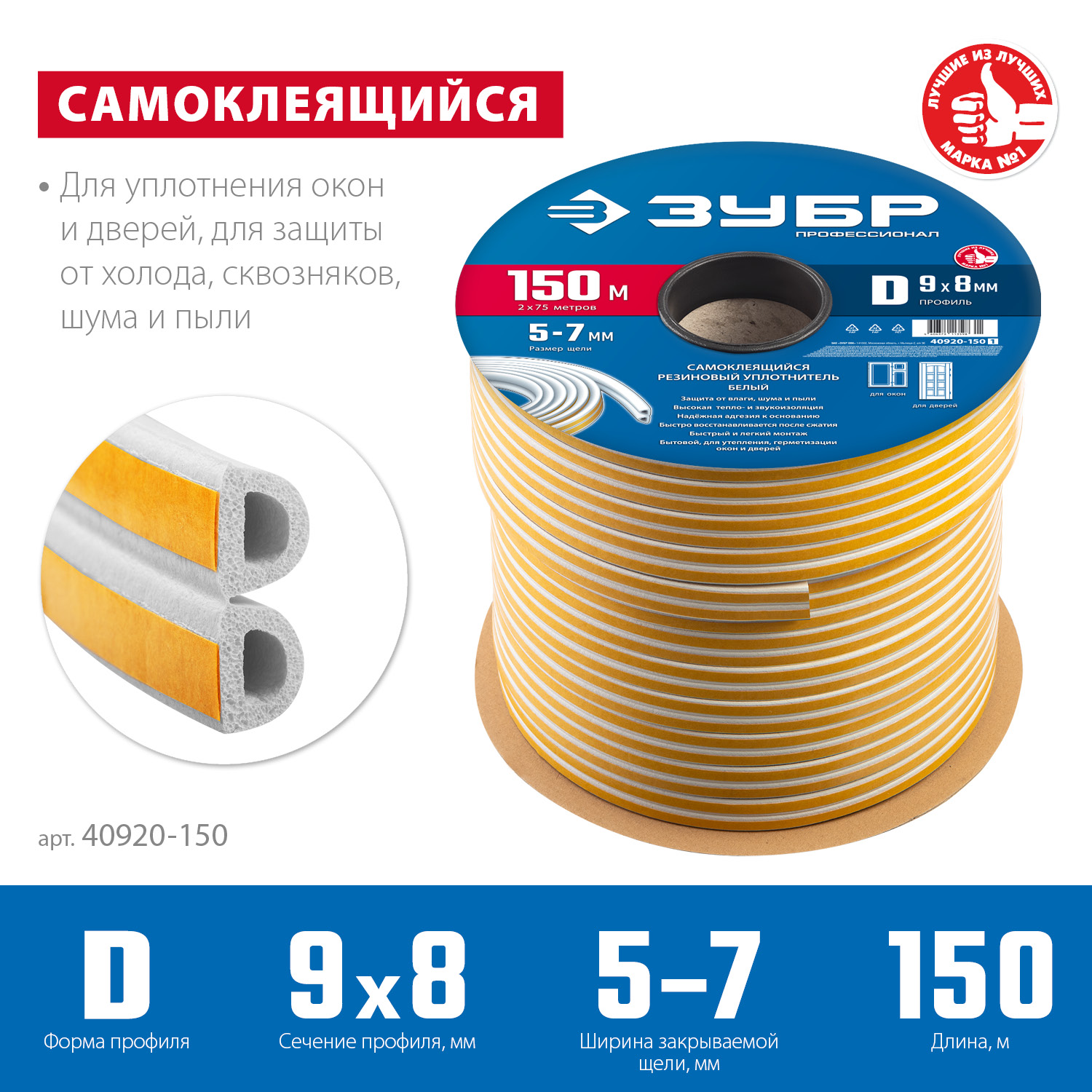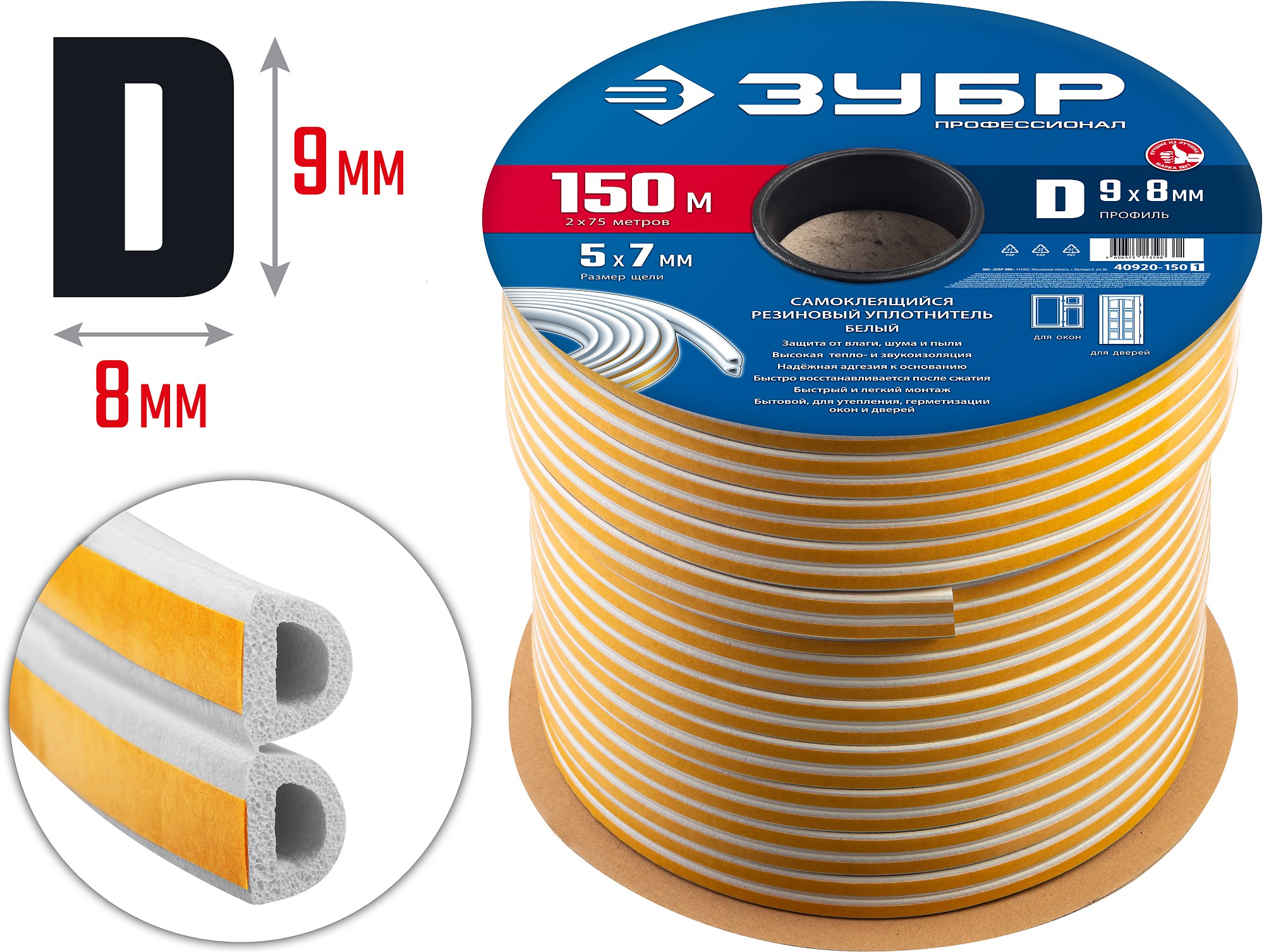 Самоклеящийся резиновый уплотнитель ЗУБР 150 м, D-профиль, размер 9 х 8 мм, белый, Профессионал 40920-150_z01 - предназначен для уплотнения окон и дверей для защиты от холода, сквозняков, шума и пыли. Обеспечивает высокую тепло- и звукоизоляцию.