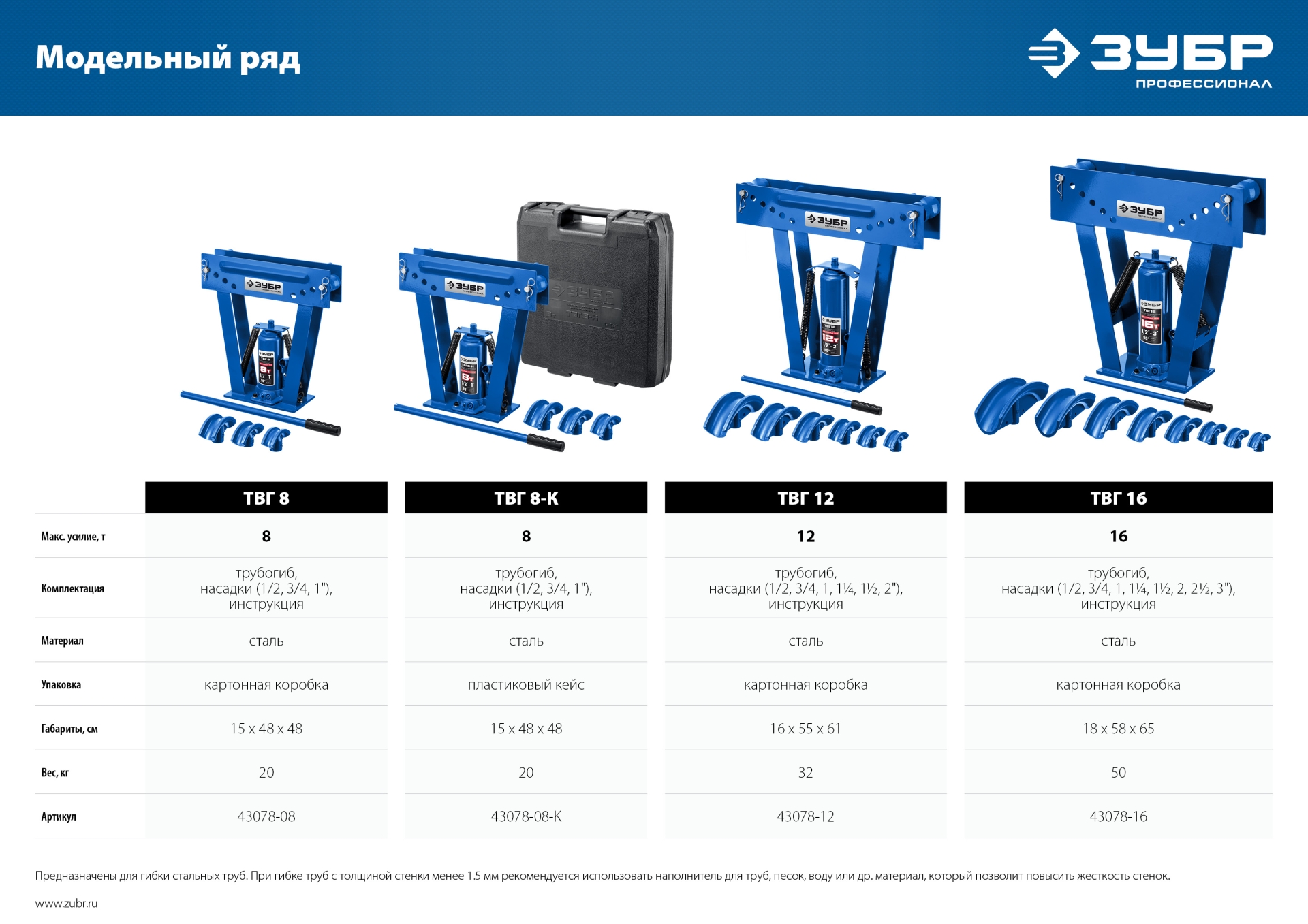 Трубогиб гидравлический с ручным приводом ТВГ-8 ЗУБР 43078-08_z01, предназначен для холодной гибки стальных водогазопроводных труб, соответствующих ГОСТ 3262-75 в диапазоне 1/2–3″, при температуре воздуха рабочей среды от -10 до +40° С.
