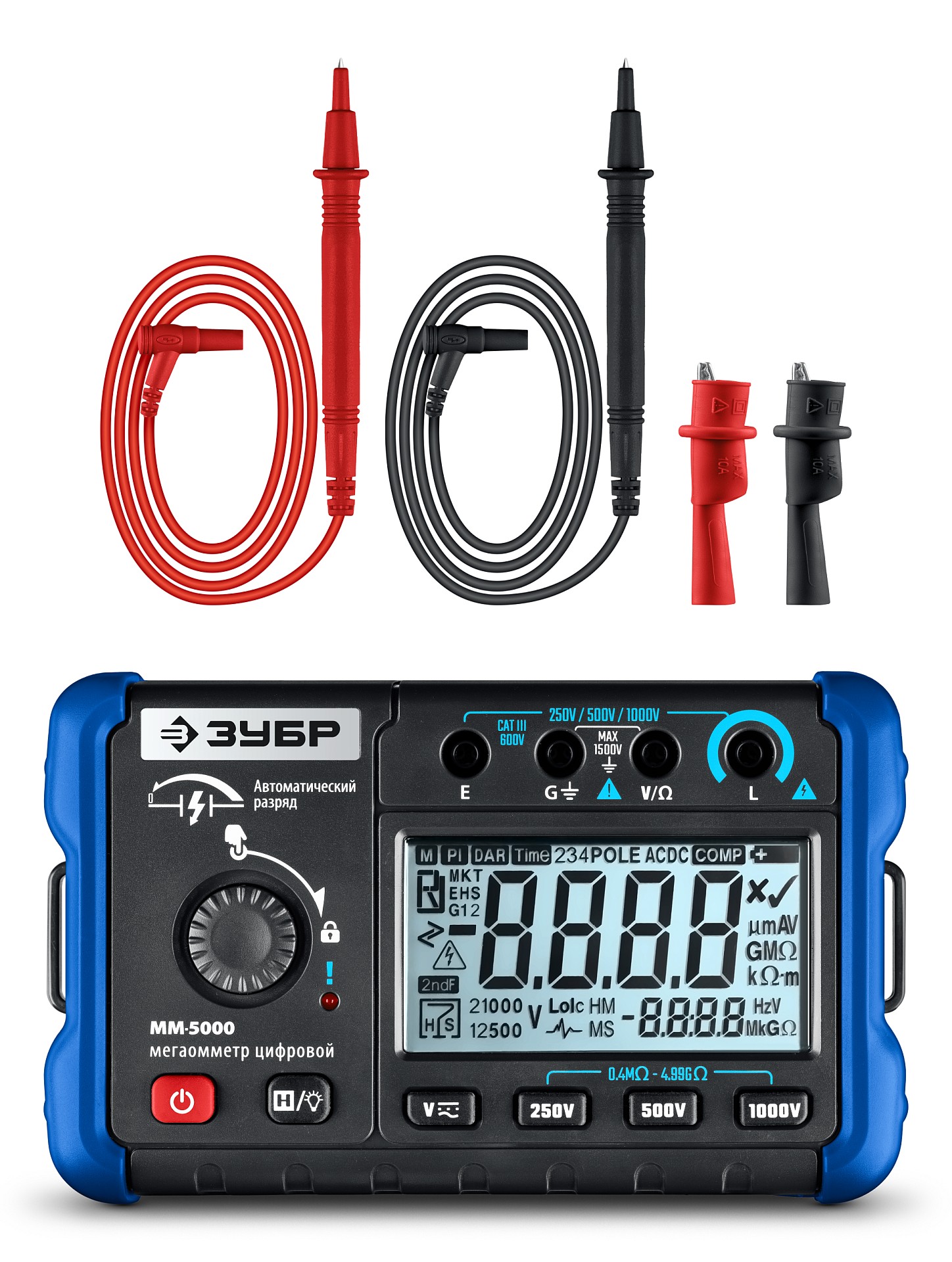 Цифровой мегаомметр ЗУБР ММ-5000 Профессионал — предназначен для точного измерения сопротивления изоляции. При возникновении высокого напряжения в исследуемой электрической цепи срабатывает световая индикация, обеспечивая безопасность и контроль при работе.