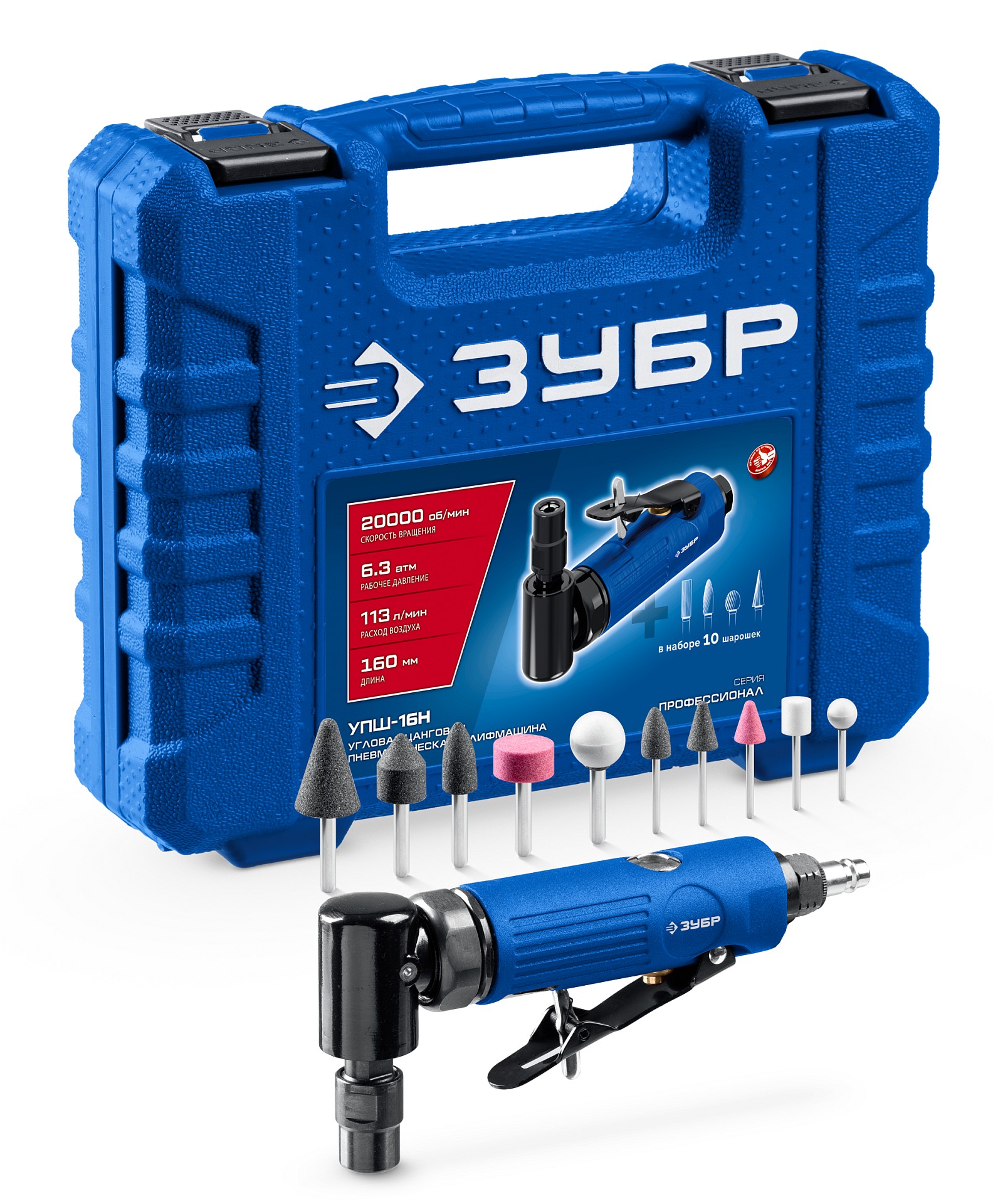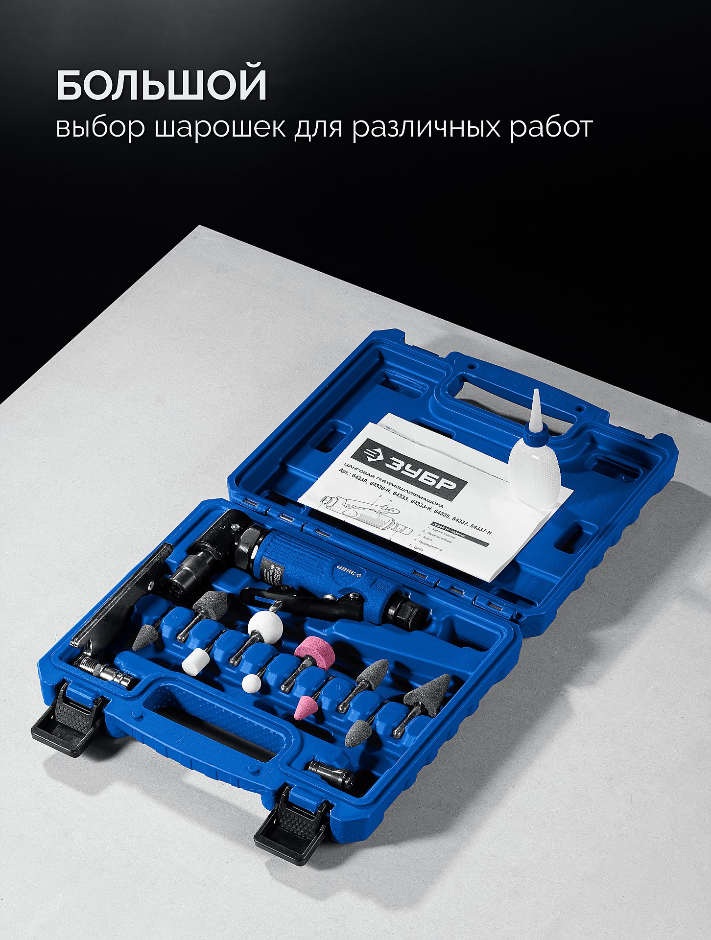 Набор в кейсе: угловая цанговая пневмошлифмашина ЗУБР, 10 шарошек и оснастка, ПРОФЕССИОНАЛ 64337-H - предназначена для шлифовальных работ в труднодоступных местах.