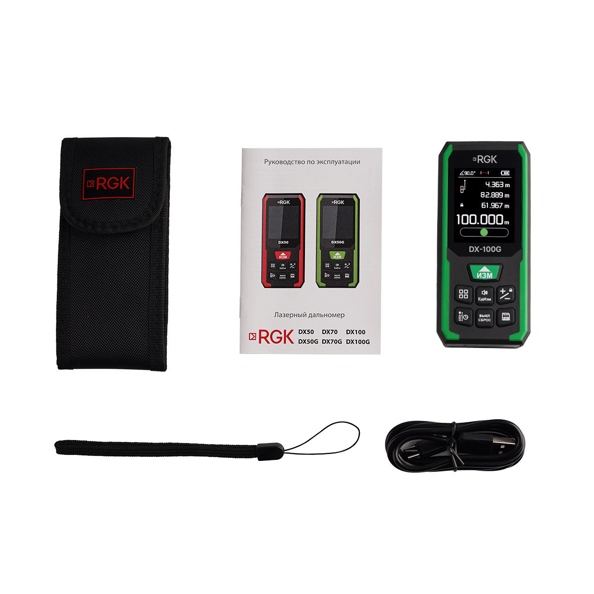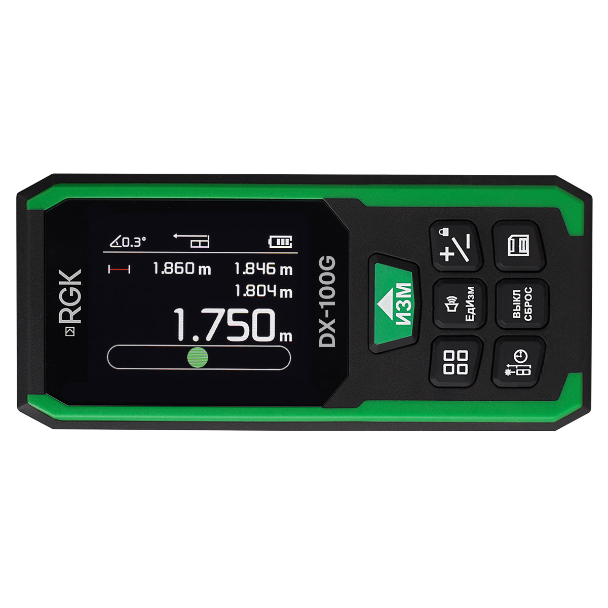 Лазерный дальномер RGK DX-100G – профессиональный измерительный инструмент строительного назначения, предназначенный для использования на дистанциях до 100 м, с помощью которого можно выполнять обмеры участков, строений и прочих объектов. Прибор оборудован зеленым излучателем, упрощающим выполнение работ на ярком солнце – за счет хорошей различимости маркера, используемого для визуального наведения, а встроенный инклинометр позволяет контролировать величину вертикальных углов и производить выравнивание. К преимуществам изделия относится наличие цветного графического дисплея, обеспечивающего высокую наглядность и информативность, а также аккумуляторного питания с подзарядкой через USB Type-C, за счет чего инструмент отличается экономичностью, не нуждаясь в замене батареек.