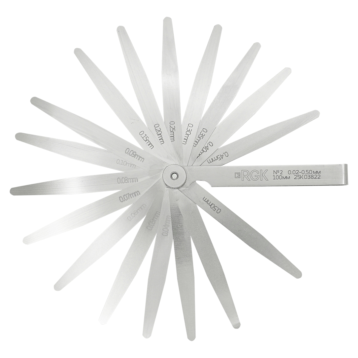 Набор щупов №2 (0,02-0,50) — включает в себя 17 плоских пластин из износостойкой стали, зауженных и скругленных в передней части, длиной 100 мм и толщиной от 0.02 до 0.10 мм, с увеличением на 0.01 мм, и от 0.15 до 0.50 мм с шагом 0.05 мм.
