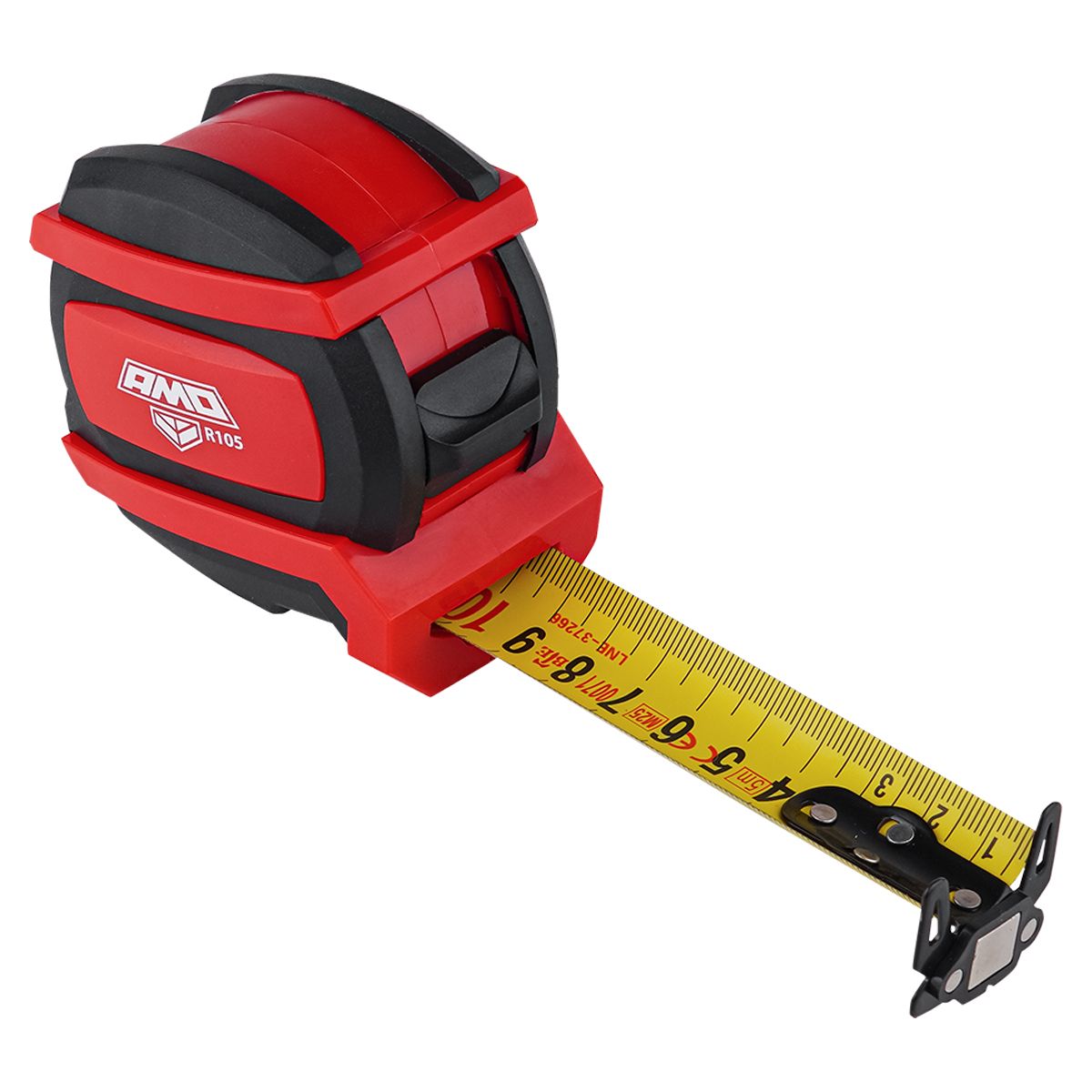 Мерная лента шириной 32 мм, изготовленная из неподверженной растяжению углеродистой стали, обладает достаточной жесткостью в рабочем положении. За счет вогнутой формы, она не заламывается при значительном вылете. Благодаря этому поддерживается прямолинейность полотна с миллиметровой разметкой, что не только облегчает обмеры, выполняемые в одиночку, но и позволяет производить с помощью рулетки AMO R105 с широкой лентой простые разметочные работы, как обычной линейкой. Для упрощения закрепления края ленты за внешние грани предметов, находящихся на большом удалении от пользователя, торцевая часть измерителя снабжена двусторонним усиленным зацепом увеличенного размера. Возможность фиксации нулевой точки отсчета рулетки на стальных конструкционных элементах обеспечивают плоские неодимовые магниты.