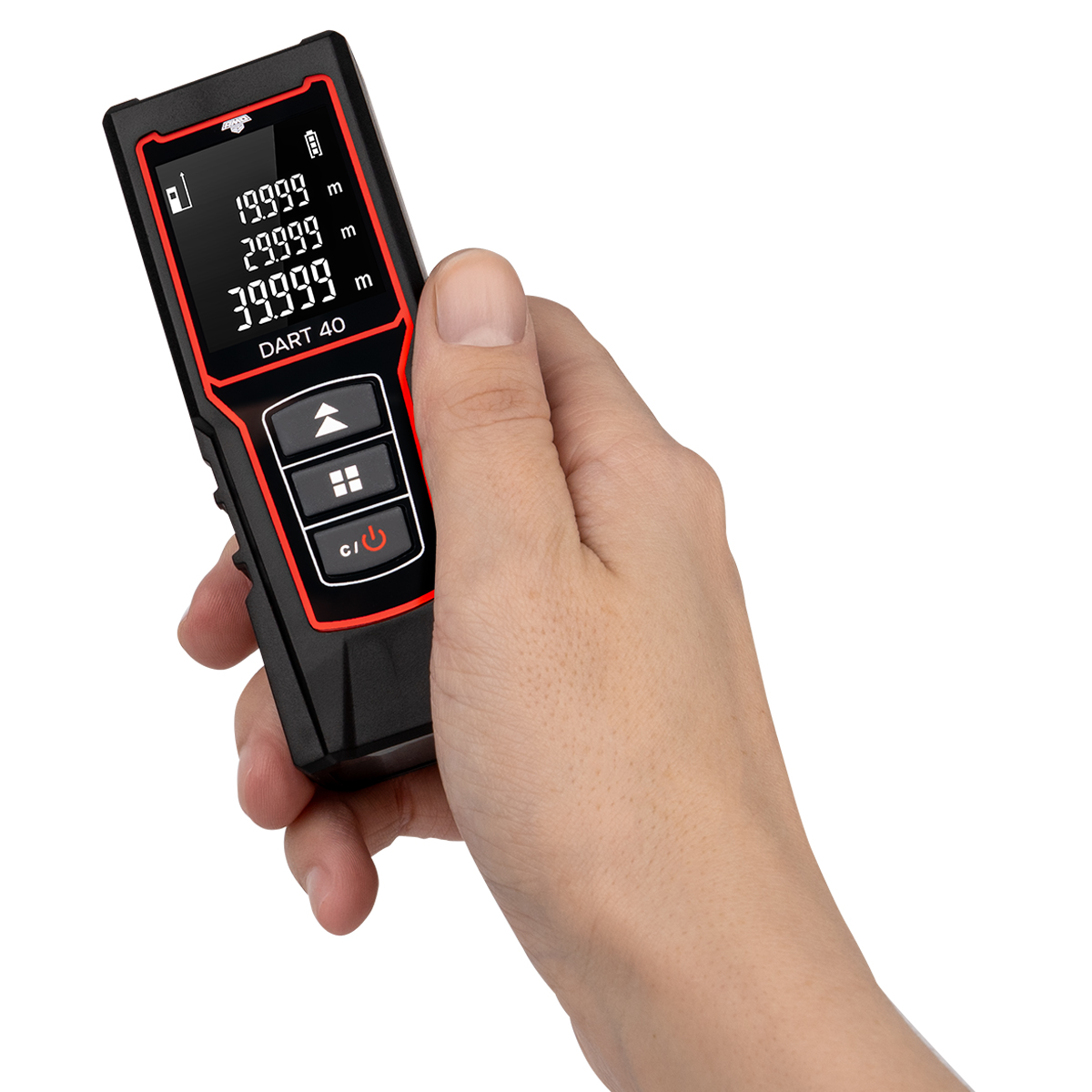 - Лазерная рулетка AMO DART 40 запоминает последние 20 измерений, так что вы можете быстро вернуться к нужному значению без повторного сканирования.