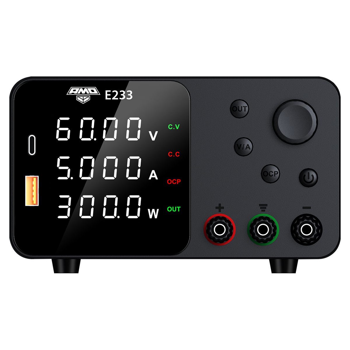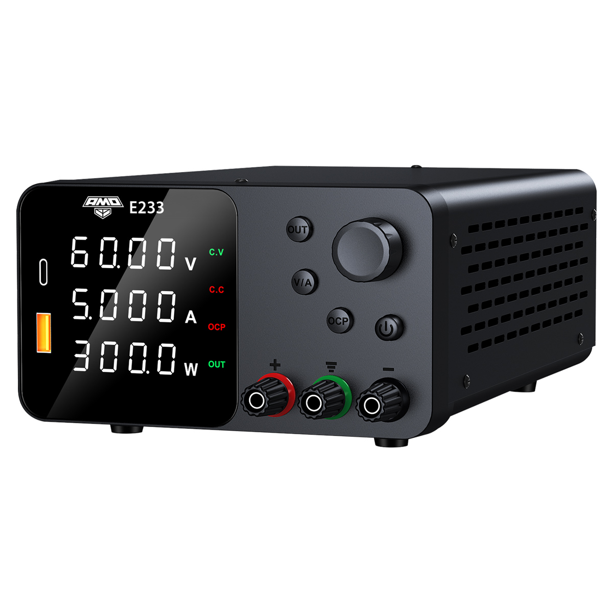 Источник питания AMO E233 — профессиональное устройство с выходным напряжением до 60 В, током до 5 А и максимальной мощностью 300 Вт.